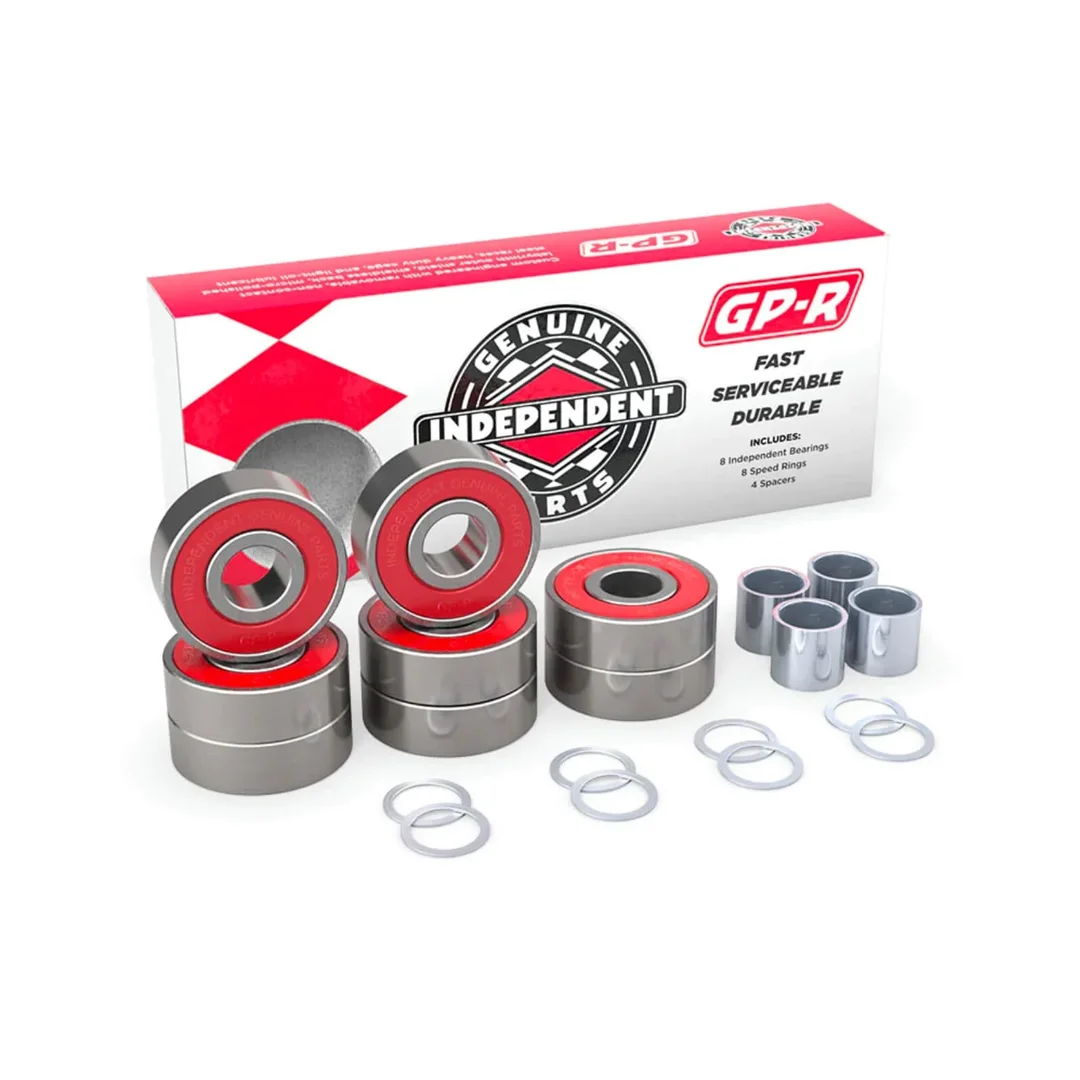 Baleros Independent Modelo GP-R (Red). La gama de alto rendimiento de la serie Genuine Parts. Estos rodamientos ofrecen una precisión de ingeniería superior, situándose en un rendimiento equivalente a ABEC 7+ o “Skate Rated” de alta gama. Fabricados con acero endurecido y pistas de alta precisión, son comparables a los líderes del mercado en velocidad y resistencia para trucos de alto impacto.