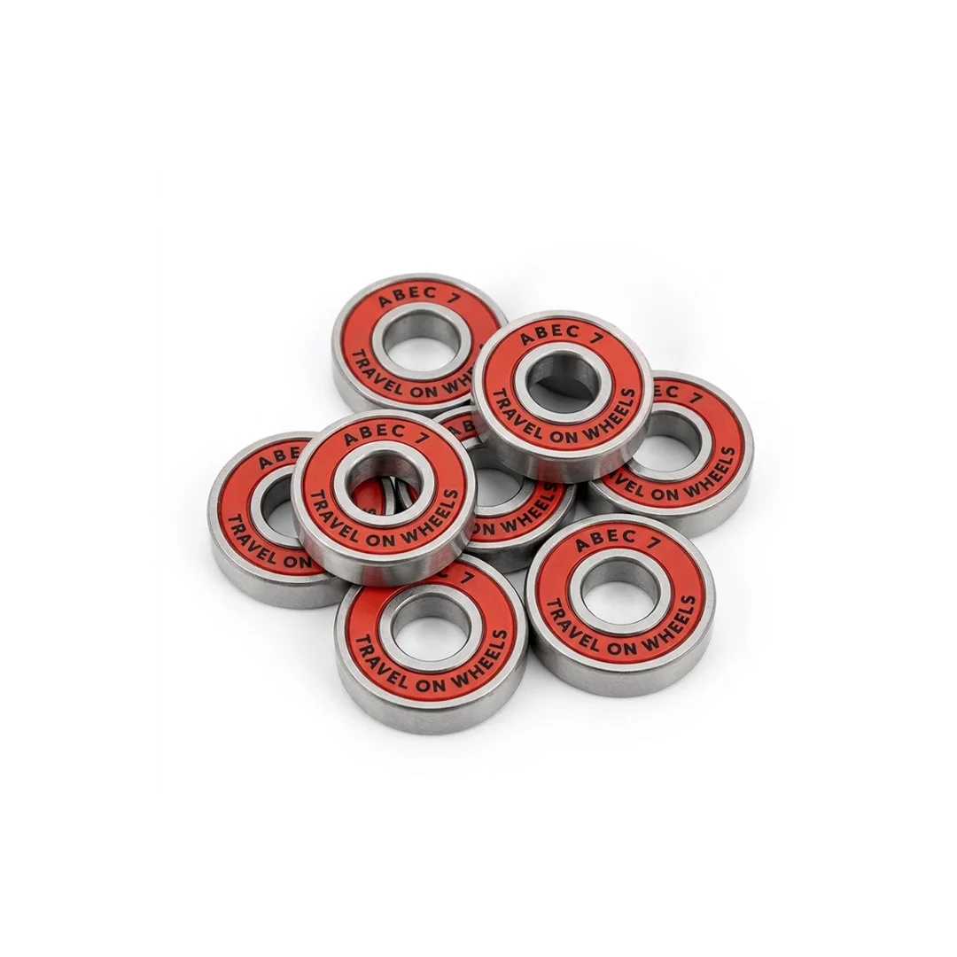 Baleros Travel On Wheels Traveler ¡Velocidad de altos vuelos para tus sesiones diarias! Los baleros Travel On Wheels Traveler te ofrecen un rendimiento superior con una estética viajera inconfundible. Su original empaque simula un sello postal azul y rojo con la silueta de un avión, mientras que en su interior resguardan rodamientos con vistosas tapas rojas que lucen el nombre de la marca en un anillo negro. Con una precisión de grado ABEC 7, están diseñados para brindarte una aceleración rápida y un rodaje sumamente consistente. Gracias a su construcción de alta tolerancia, es la herramienta adecuada para ganar inercia sin esfuerzo tanto en asfalto como en el concreto pulido del skatepark.