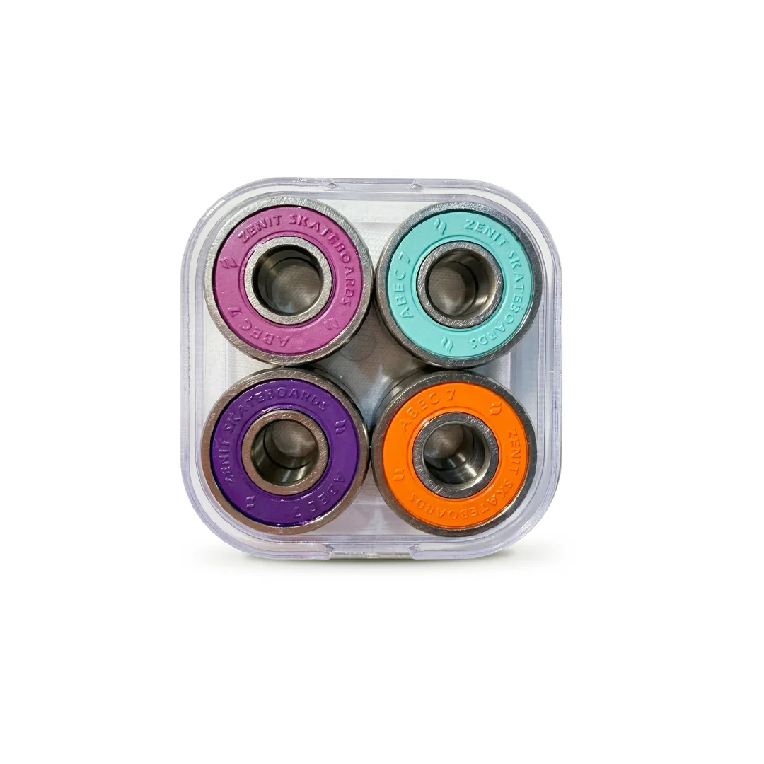 Baleros Zenit Colores ABEC 7. Dale un toque de personalidad a tu setup sin sacrificar el rendimiento con los baleros Zenit de colores. Este set ABEC-7 ofrece el equilibrio perfecto entre durabilidad y velocidad, con protectores en tonos vibrantes (púrpura, turquesa, naranja y rosa) que facilitan la identificación y personalización de tus ruedas. Son la opción ideal para el patinado diario, ofreciendo una resistencia superior ante los impactos de trucos técnicos.