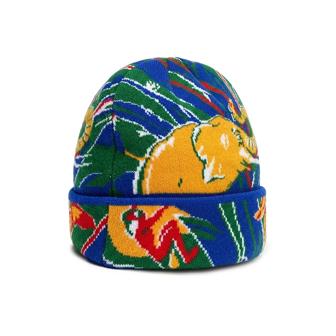 Beanie Alltimers Elephant Blue Green. Eleva tu outfit con el Beanie Alltimers Elephant, una pieza que rompe con lo convencional a través de un diseño vibrante y artístico. Este gorro presenta un patrón completo (all-over print) tejido que muestra un elefante psicodélico entre vegetación tropical en colores azul, verde y amarillo. Es el accesorio definitivo para quienes buscan destacar en la ciudad con una estética streetwear de alta gama y un toque de humor irreverente.