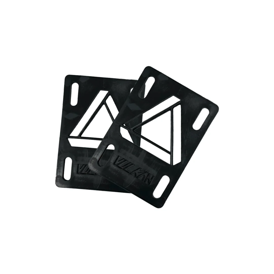 Elevadores Vulkan 1/8″ Negro ¡Optimiza tu altura y protege tu tabla! Estos elevadores (risers) Zenit de 1/8″ en color Negro son el componente esencial para evitar el molesto wheelbite y proteger la base de tu deck. Fabricados con polímero de alta resistencia, proporcionan la separación justa entre tus trucks y la tabla, permitiendo un giro más libre y reduciendo la tensión en la madera sin alterar drásticamente tu centro de gravedad.