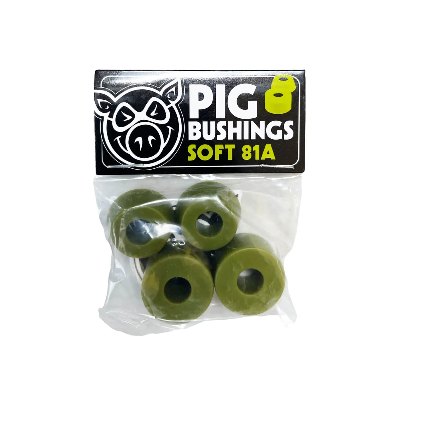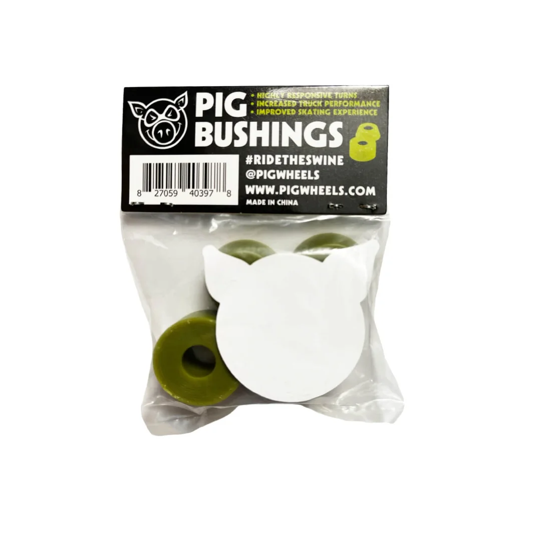 Gomas Cilíndricas Pig Soft 81A Verde. Dale a tus trucks una libertad de giro total con las gomas Pig Soft. Con una dureza de 81A, estas gomas son de las más suaves del mercado, diseñadas específicamente para quienes prefieren un skate fluido, giros cerrados y una respuesta inmediata sin tener que aplicar demasiada presión. Su forma cilíndrica proporciona una mayor estabilidad en el centro del giro en comparación con las gomas cónicas, asegurando que tu tabla regrese siempre a su posición inicial con suavidad.
