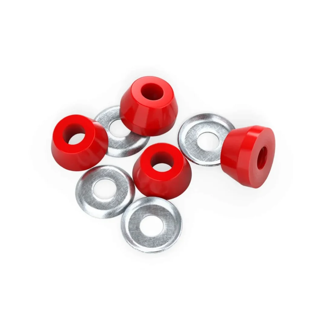 ✅ Kit Completo: Incluye las 4 gomas rojas necesarias para dos trucks y sus respectivas rondanas (washers) adaptadas.