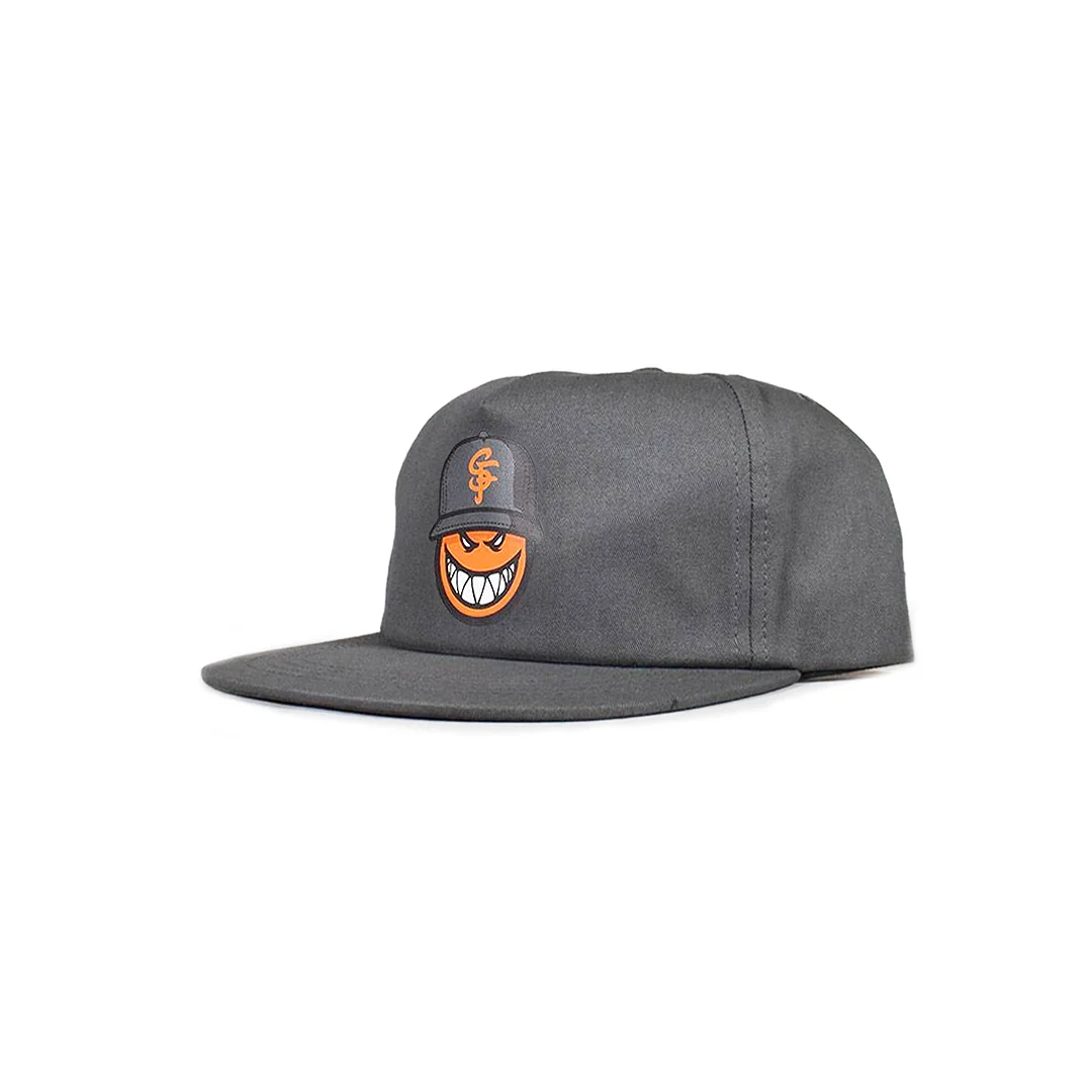 Gorra Thrasher X Spitfire SF Loc. Una colaboración legendaria que une a dos de las marcas más icónicas del skateboarding mundial. Esta gorra presenta un diseño estructurado en un tono gris oscuro, destacando por un parche frontal único que fusiona el emblemático logotipo de la flama de Spitfire con una estética clásica de béisbol de San Francisco. Es el accesorio ideal para quienes buscan representar la cultura del skate más pura con un estilo urbano y resistente.