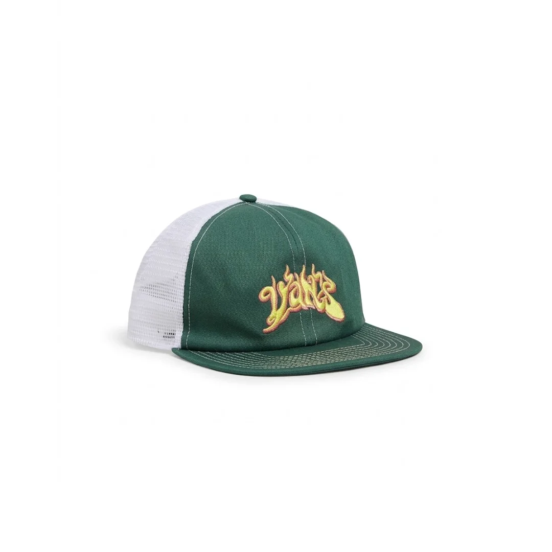 Gorra Vans Higher Unstructured Verde. Lleva el estilo “Off The Wall” a otro nivel con la gorra Vans Higher. Este modelo tipo trucker destaca por su panel frontal en un verde bosque profundo y un gráfico de “Vans” bordado con una tipografía de estilo psicodélico en tonos amarillos y naranjas que simulan llamas. Su diseño combina la herencia clásica de la marca con una construcción ligera y relajada, perfecta para cualquier sesión bajo el sol.