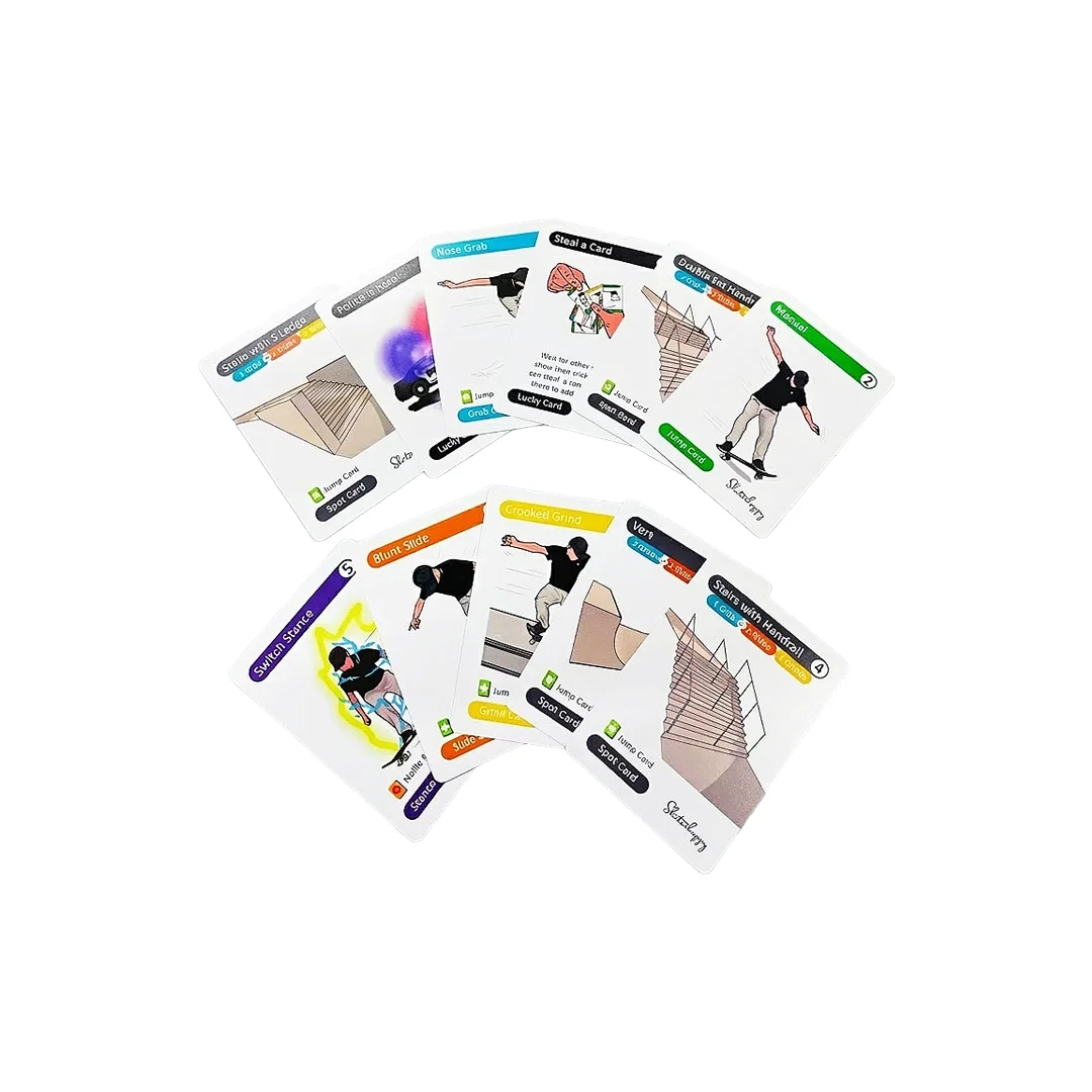 – Desarrollo: En tu turno, puedes buscar crear un combo. El proceso creativo empieza por la Spot Card (el lugar, como un “Double Set Handrail”). Luego añades Jump Cards (como “Kickflip”) para formar el truco. Tienes hasta tres oportunidades para intercambiar cartas del mazo y mejorar tu mano antes de presentar tu truco final. Ciertas cartas especiales como el Skato Cop pueden ser usadas para afectar las jugadas de otros competidores.