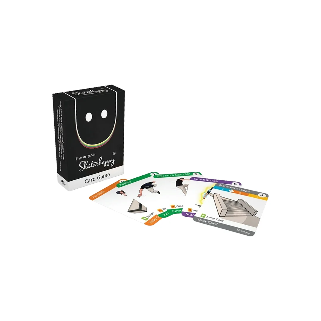 Juego de Cartas Skaterhappy. Experimenta la adrenalina de planear tus trucos como un profesional con el Original Skaterhappy Card Game. Este juego no solo pone a prueba tus conocimientos de skate, sino tu capacidad creativa para formular las líneas y combos más extremos. Basado en el proceso mental real de un skater, el juego se divide en la selección del lugar (Spot) y la ejecución del truco (Jump/Slide).
