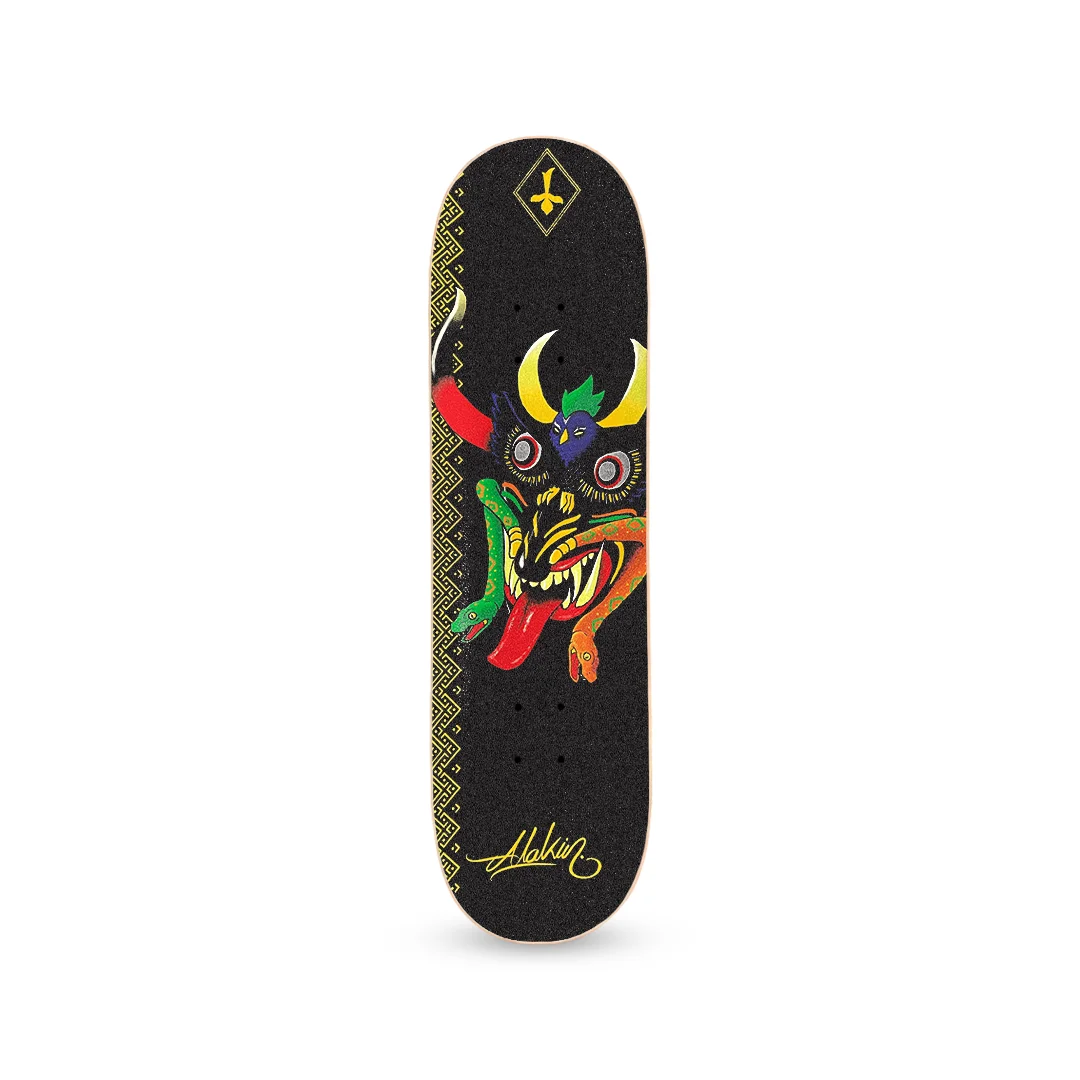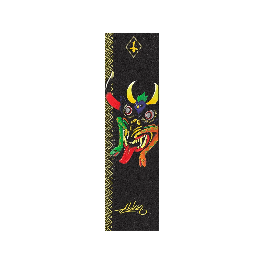 Lija Alakin Máscara Alakin. Eleva la estética de tu tabla con la lija Alakin, una pieza que destaca por su diseño artístico inspirado en máscaras tradicionales con detalles vibrantes. Esta lija no solo ofrece una apariencia visualmente impactante, sino que está fabricada bajo estándares de calidad profesional para asegurar que el rendimiento de tu skate esté a la altura de su diseño.