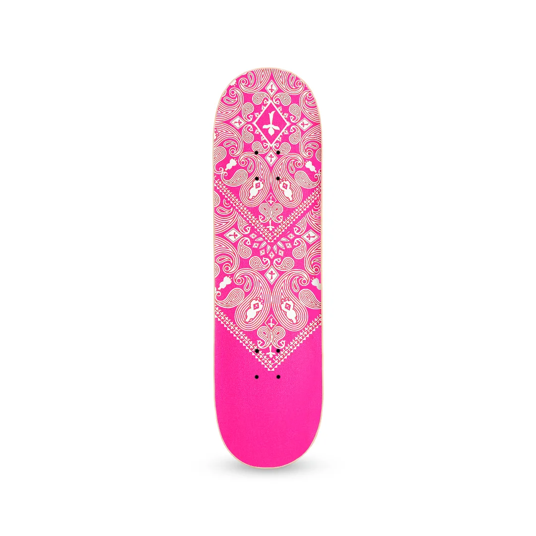 Lija Alakin Paliacate Rosa. Dale un estilo vibrante y tradicional a tu tabla con la lija Paliacate Rosa de Alakin. Este diseño rinde homenaje al icónico pañuelo de origen hindú, popularizado en la cultura mexicana y el estilo urbano, con un patrón intrincado en color blanco que resalta sobre un fondo rosa fucsia sumamente llamativo. Es la opción ideal para quienes buscan un setup con personalidad fuerte y gran visibilidad.