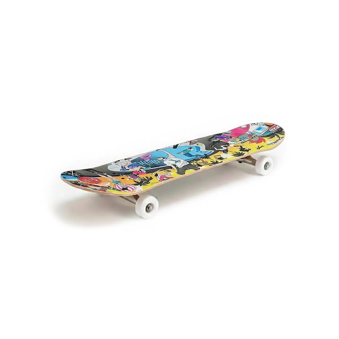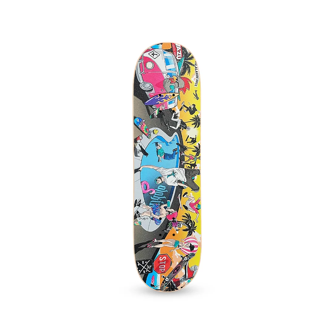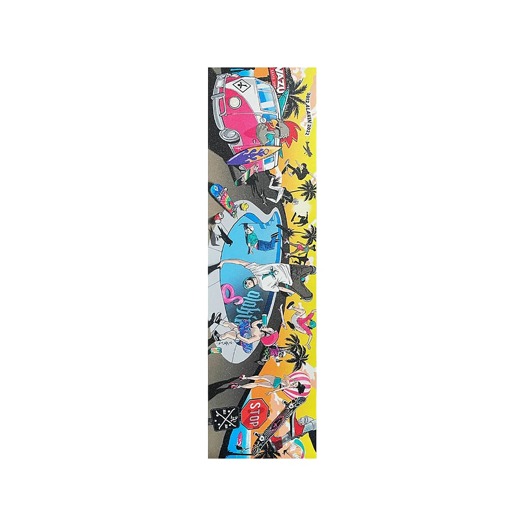 Lija Alakin Skate Party ¡Toda la cultura del skate en una sola lija! El modelo Skate Party de Alakin es una explosión de color y detalles, presentando una ilustración vibrante que captura la esencia de una sesión épica: albercas, palmeras, camionetas clásicas y patinadores en plena acción. Es el setup definitivo para quienes quieren que su tabla cuente una historia y destaque con un estilo artístico detallado sin sacrificar el agarre profesional.