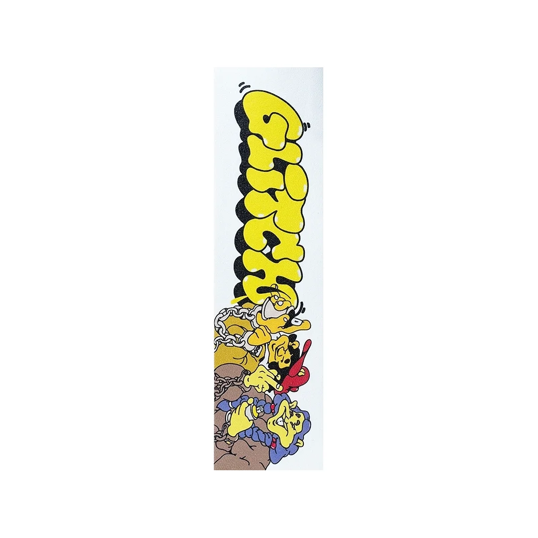 Lija Glitch Gang Transparente. Dale un estilo auténtico y urbano a tu setup con la lija Glitch Gang Transparente. Este diseño destaca por su tipografía estilo graffiti en amarillo brillante y un gráfico de personajes detallados en la parte inferior, todo impreso sobre una base transparente de alta calidad. Al ser translúcida, te permite lucir el color de la madera o los detalles del gráfico superior de tu tabla, creando un efecto visual de capas que pocos accesorios pueden ofrecer.