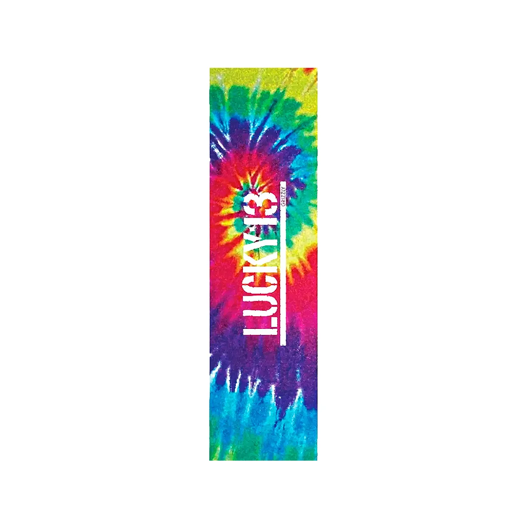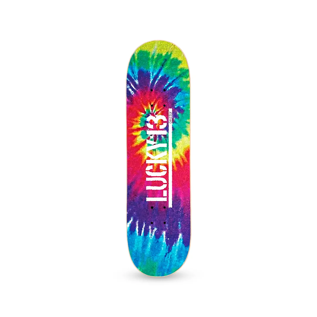 Lija Grizzly X Lucky 13 Tie Dye. Para los que no quieren pasar desapercibidos, la versión Tie Dye de esta colaboración ofrece una explosión de color psicodélico. El logotipo de Lucky 13 resalta sobre una espiral de colores vibrantes que le dará una personalidad única a tu tabla.