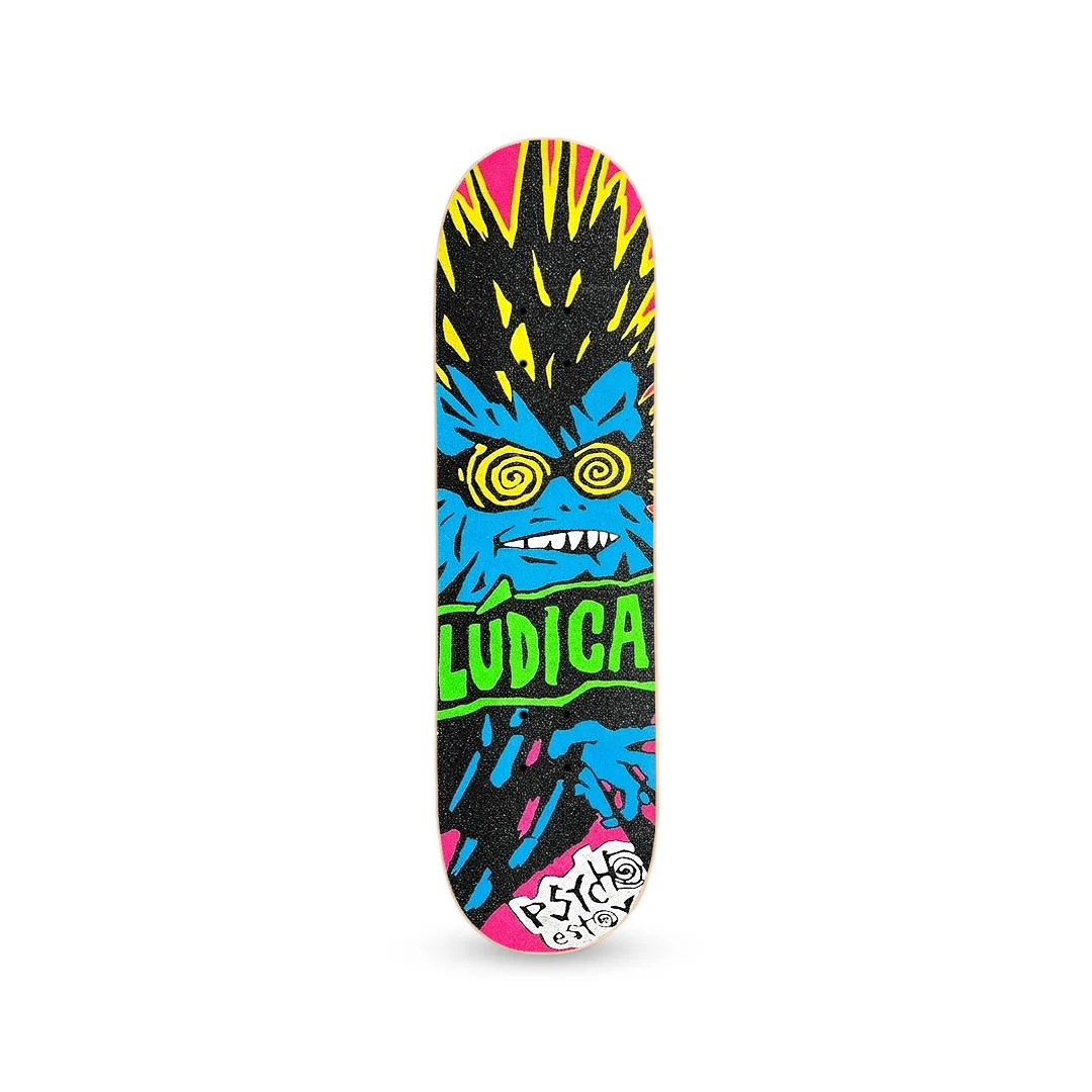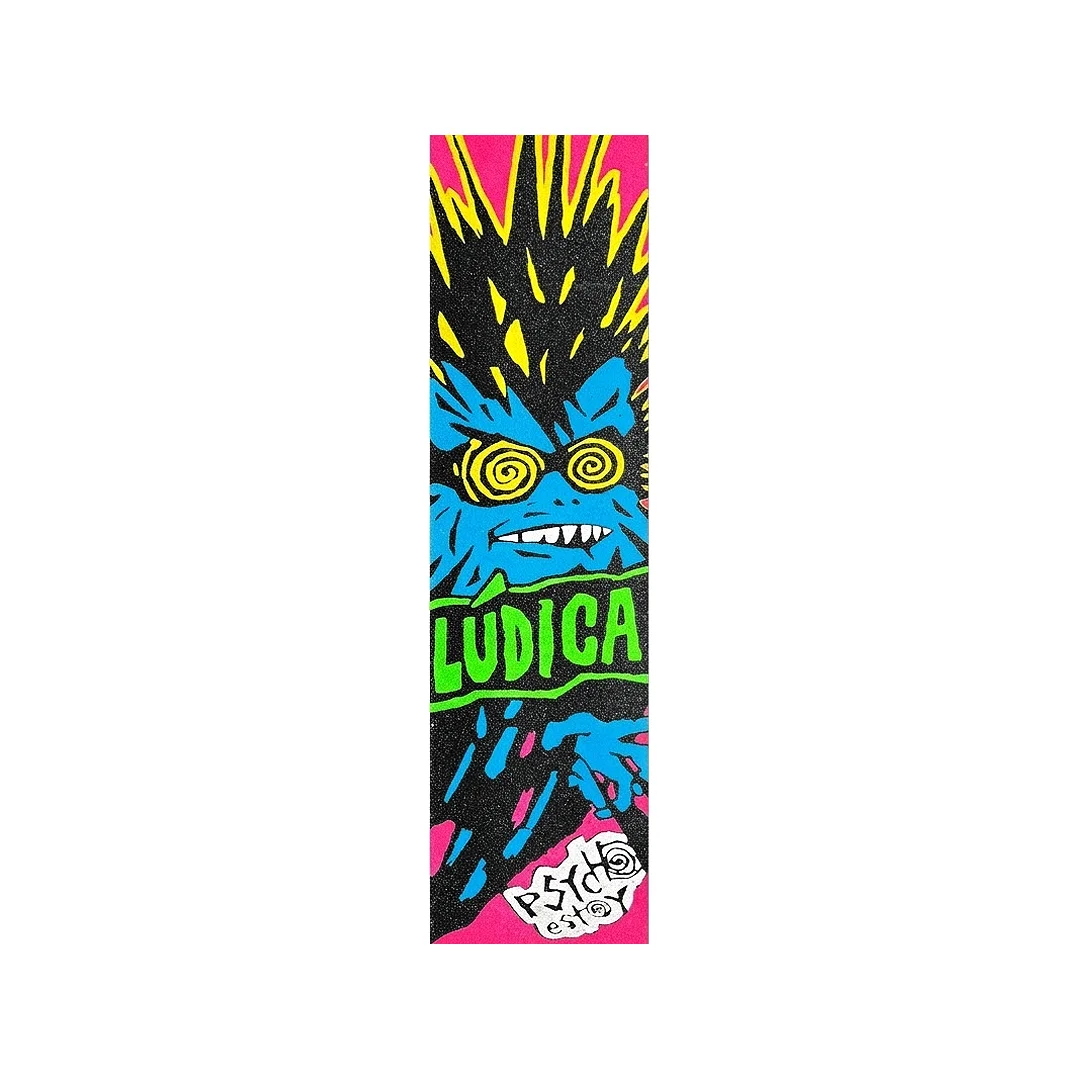 Lija Lúdica Psycho Estoy Azul. Personaliza tu deck con el arte vibrante de Lúdica. Esta lija presenta el diseño “Psycho Estoy” en una explosión de colores neón sobre azul, combinando una estética psicodélica y disruptiva con la calidad técnica necesaria para mantener tus pies pegados a la tabla en cada truco.