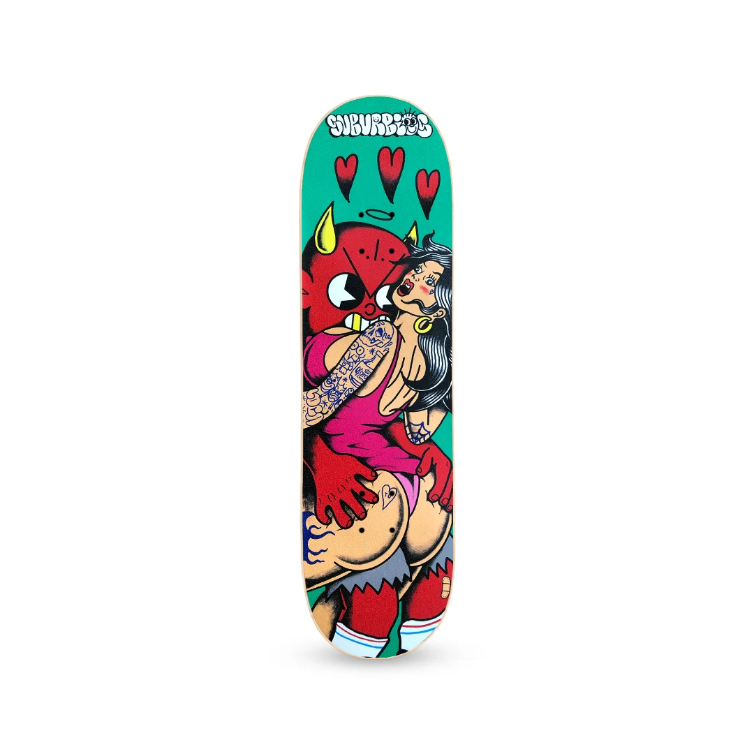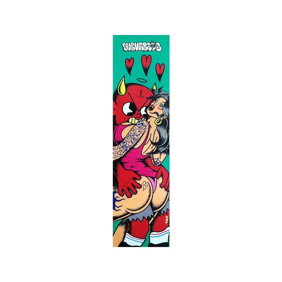 Lija Suburbios X Mal Portado y Herido “Juntos por Siempre” ¡Lealtad y tinta hasta el final! Este diseño captura una escena intensa sobre un fondo color verde azulado (teal). Muestra al icónico diablito rojo en un abrazo con una mujer tatuada, bajo una lluvia de corazones, evocando el estilo clásico del tatuaje old school con el toque crudo de Mal Portado y Herido. Su superficie de grano medio asegura un control funcional y constante.