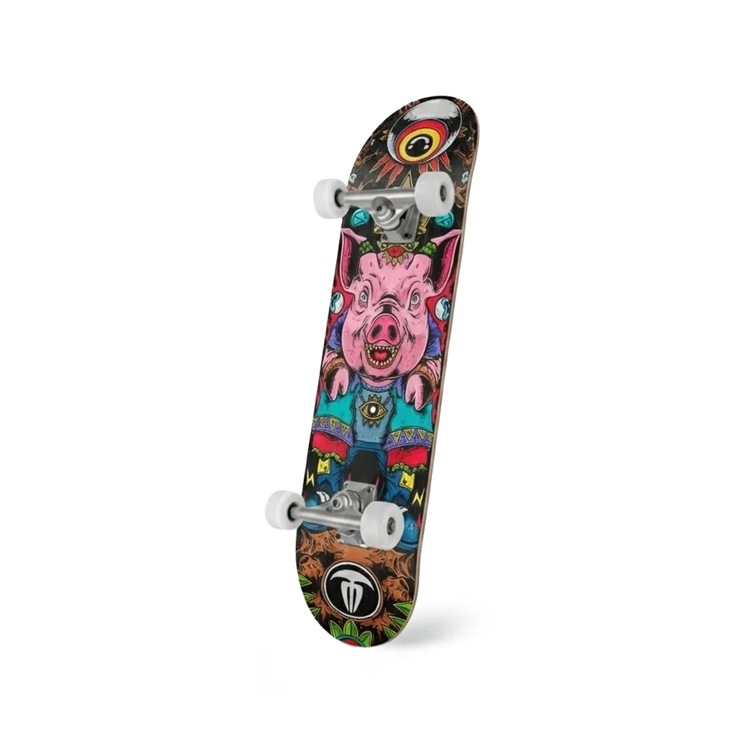 Patineta Armada Toxina King Pig 8.5″ ¡Tu setup pesado listo para dominar! Esta patineta armada incluye el deck Toxina King Pig en la medida amplia de 8.5″. Ensamblada profesionalmente con componentes robustos, es la elección ideal para skaters de parque, transición o aquellos que priorizan la estabilidad sobre la ligereza. Equipada con trucks Confiables, ruedas 54mm 100A y baleros ABEC 7, está lista para sesiones intensas.