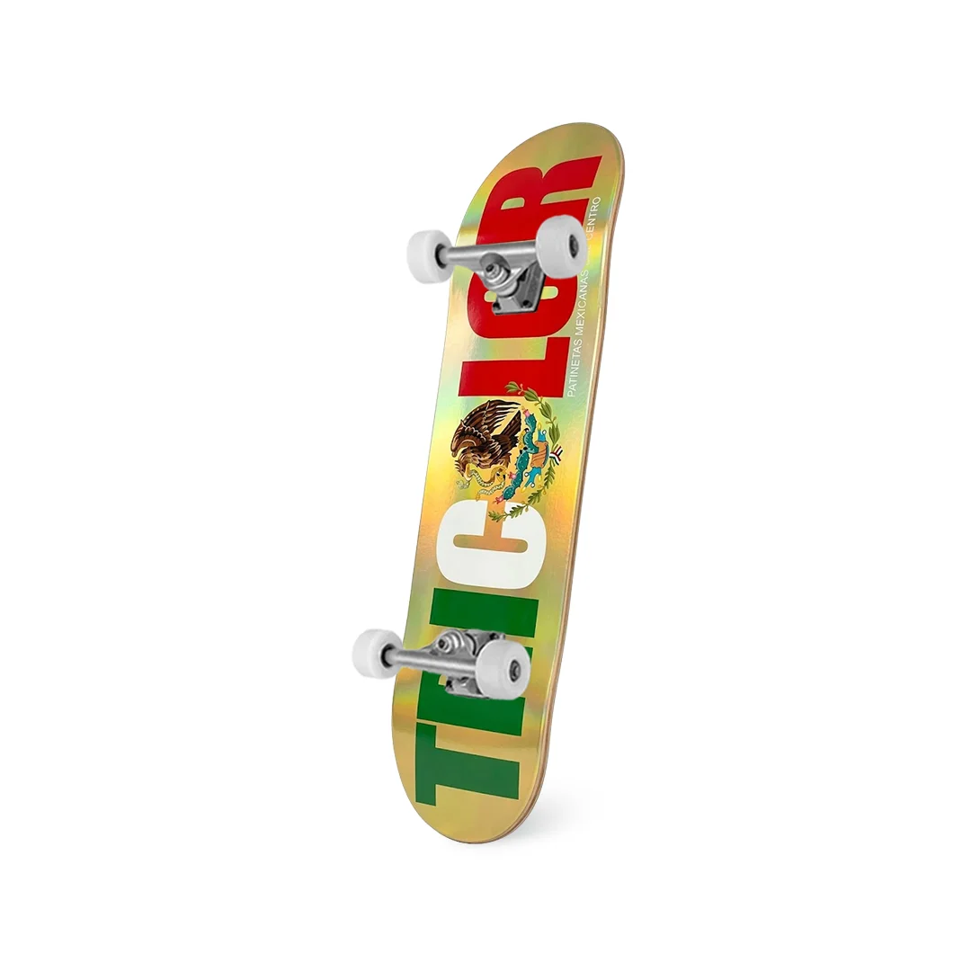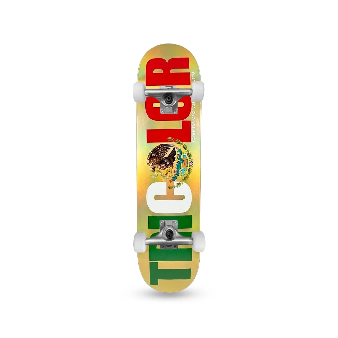 Patineta Armada Tricolor Bandera Foil Oro 8″ ¡Identidad y rendimiento profesional listos para rodar con todo el estilo! Esta patineta armada monta el espectacular deck “Bandera Foil Oro” de Tricolor en la clásica medida técnica de 8.0″. Es el setup definitivo tanto para quienes buscan un equipo ligero que sea fácil de maniobrar, como para los patinadores que exigen precisión en cada rotación. Ensamblada con componentes duraderos y de gran calidad, está lista para acompañarte a conquistar los spots con un brillo inigualable.