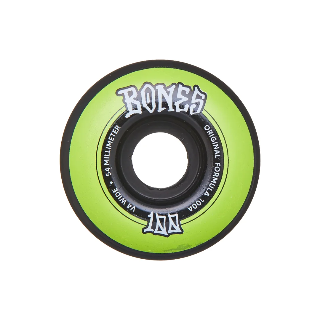 Ruedas Bones 100s Wide 100A V4 54mm Negro/Verde ¡El clásico rendimiento de Bones con un look venenoso para las calles! La línea “100s” utiliza la Original Formula (OG) de Bones, famosa por ofrecer una velocidad, un rebote y un derrape de nivel profesional sin romper tu cartera. Este modelo en particular rompe el molde visual tradicional: el uretano de toda la rueda es de un profundo color negro sólido, pero la cara frontal destaca con un brillante y agresivo estampado en color verde. Con una dureza de 100A, son unas balas en los skateparks de concreto y plazas lisas. Además, cuentan con el codiciado corte V4 (Wide), una forma ancha que maximiza la superficie de contacto con el piso. En su medida de 54mm, te entregan el balance perfecto entre estabilidad para aterrizajes pesados y ligereza para clavar tus flip tricks con altura.