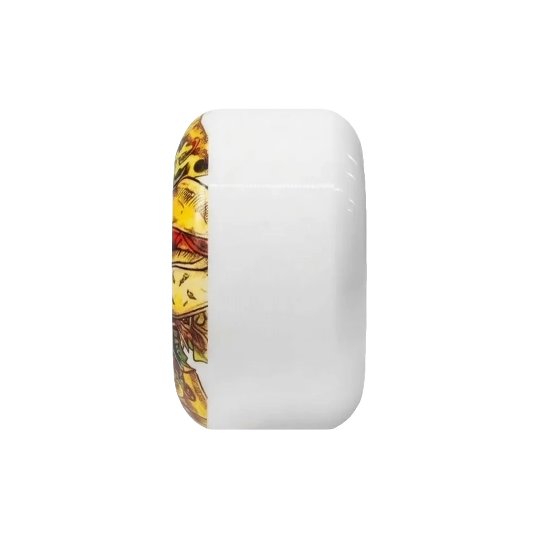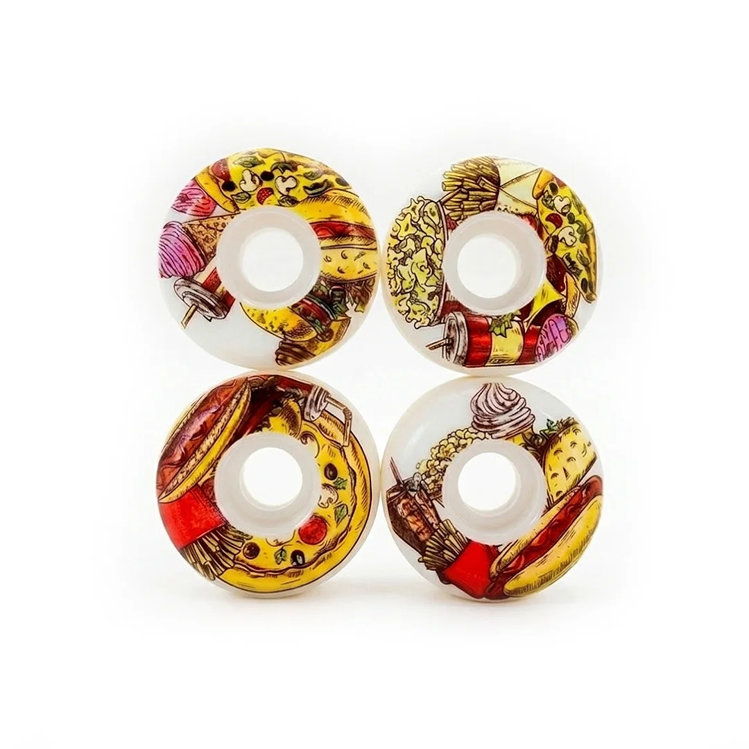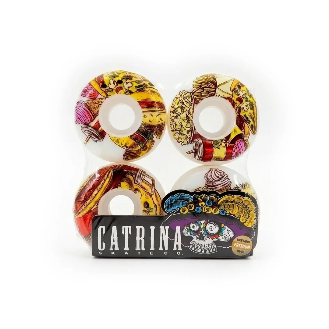 Ruedas Catrina Fast Food Cónicas 100A 54mm. Lleva el menú completo a tu sesión con las ruedas Catrina Fast Food. Este set combina los tres diseños de la serie (Pizza, Hamburguesa y Dona) en un solo paquete, ofreciendo una estética asimétrica y divertida para tu tabla. Con una dureza de 100A y un diámetro de 54mm, estas ruedas están diseñadas para ofrecer un rendimiento profesional en skateparks y superficies lisas, manteniendo la velocidad y facilitando los trucos técnicos.