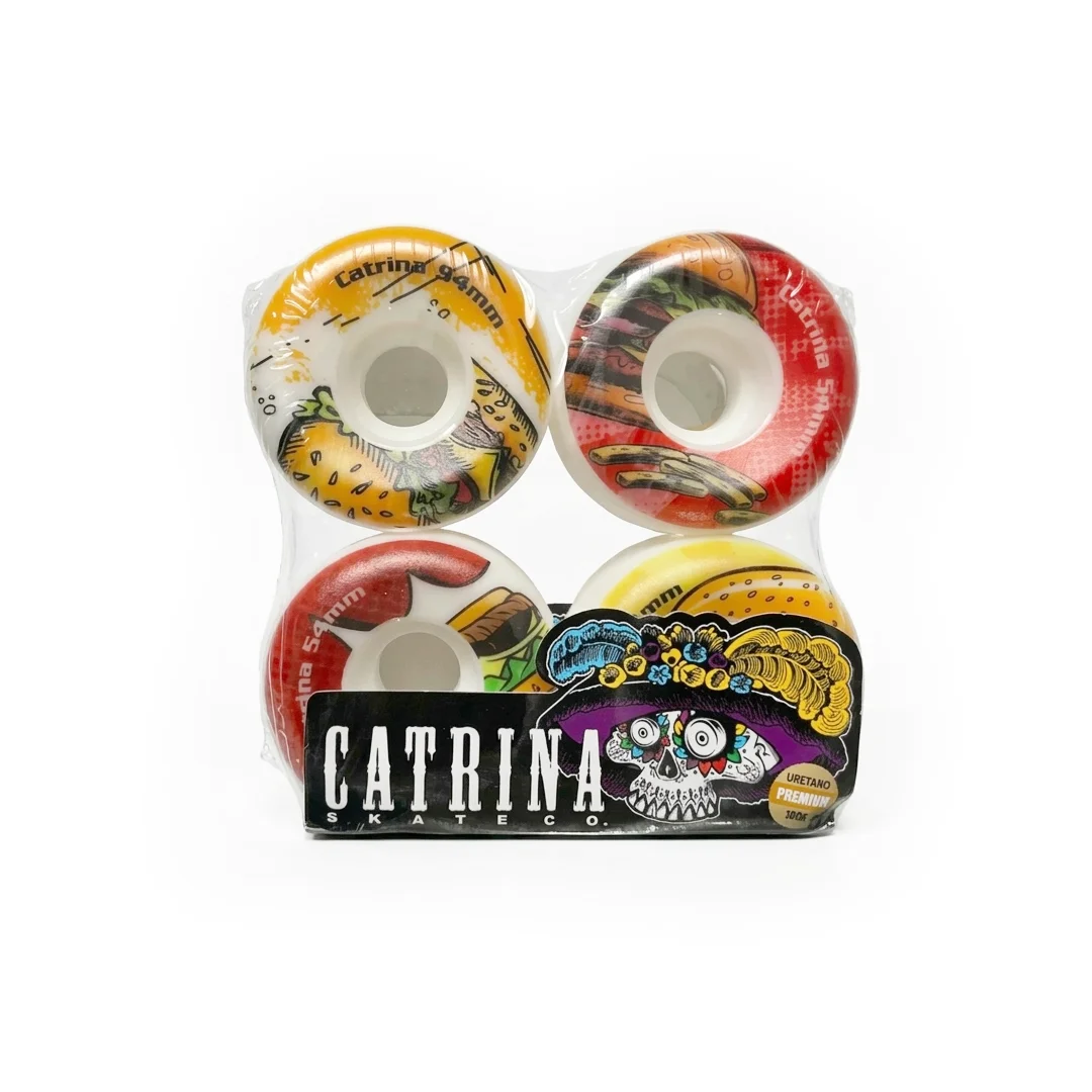 Ruedas Catrina Hamburguesa Cónicas 100A 54mm. Completa el combo con las ruedas Catrina Hamburguesa. Con un diseño creativo de una hamburguesa clásica en el gráfico frontal, estas ruedas no solo lucen increíbles, sino que ofrecen un desempeño de alto nivel. Su forma cónica está pensada para patinadores que buscan precisión y ligereza en cada movimiento, manteniendo un agarre firme cuando más lo necesitas.