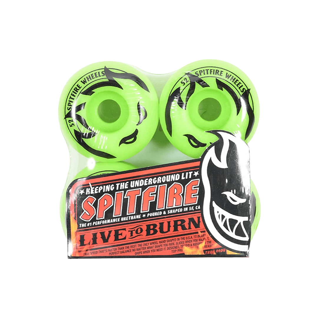 Ruedas Spitfire Live To Burn: Reconocidas mundialmente por su calidad, estas ruedas Spitfire de 52mm y 99D (≈ 99A) de dureza son la elección profesional para skate street y skateparks. Fabricadas con su exclusivo uretano Formula Four (F4) de alta duración, estas ruedas garantizan la mejor relación entre velocidad, agarre y durabilidad.