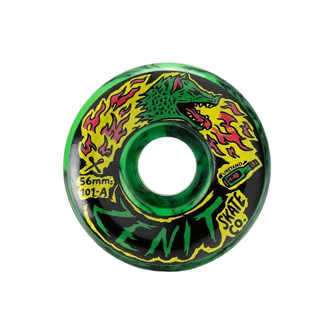 Ruedas Zenit Hiena Cónicas 101A Swirl Negro/Verde 56mm ¡Velocidad salvaje y un look letal para destruir las transiciones! La marca mexicana Zenit Skate Co. sube el nivel de agresividad con este modelo. Lo primero que te atrapará es su increíble uretano “Swirl”, una mezcla marmoleada de colores verde brillante y negro profundo que hace que cada rueda sea visualmente única. Sobre esta base, resalta un feroz gráfico de una hiena escupiendo fuego, acompañado del logotipo clásico de la marca en letras puntiagudas. Más allá de su estética, son unas bestias del rendimiento: con una dureza extrema de 101A y un generoso diámetro de 56mm, están diseñadas para generar una inercia brutal en los bowls, rampas o skateparks grandes, reteniendo el impulso al máximo. Su corte Cónico te brinda una pisada más ancha y estable, perfecta para amarrarte a los metales sin resbalar.