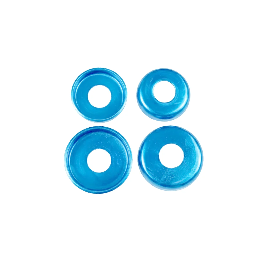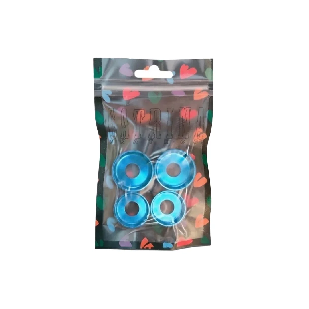 Set de Cazuelas Catrina Azules. Dale un toque de color personalizado a tus trucks con el Set de Cazuelas Catrina en color Azul Metálico. Estas arandelas de alto rendimiento no solo mejoran la estética de tu skate, sino que optimizan la respuesta de tus gomas al evitar que se expandan de más durante los giros cerrados. Su acabado azul brillante destaca sutilmente debajo de tus ejes.