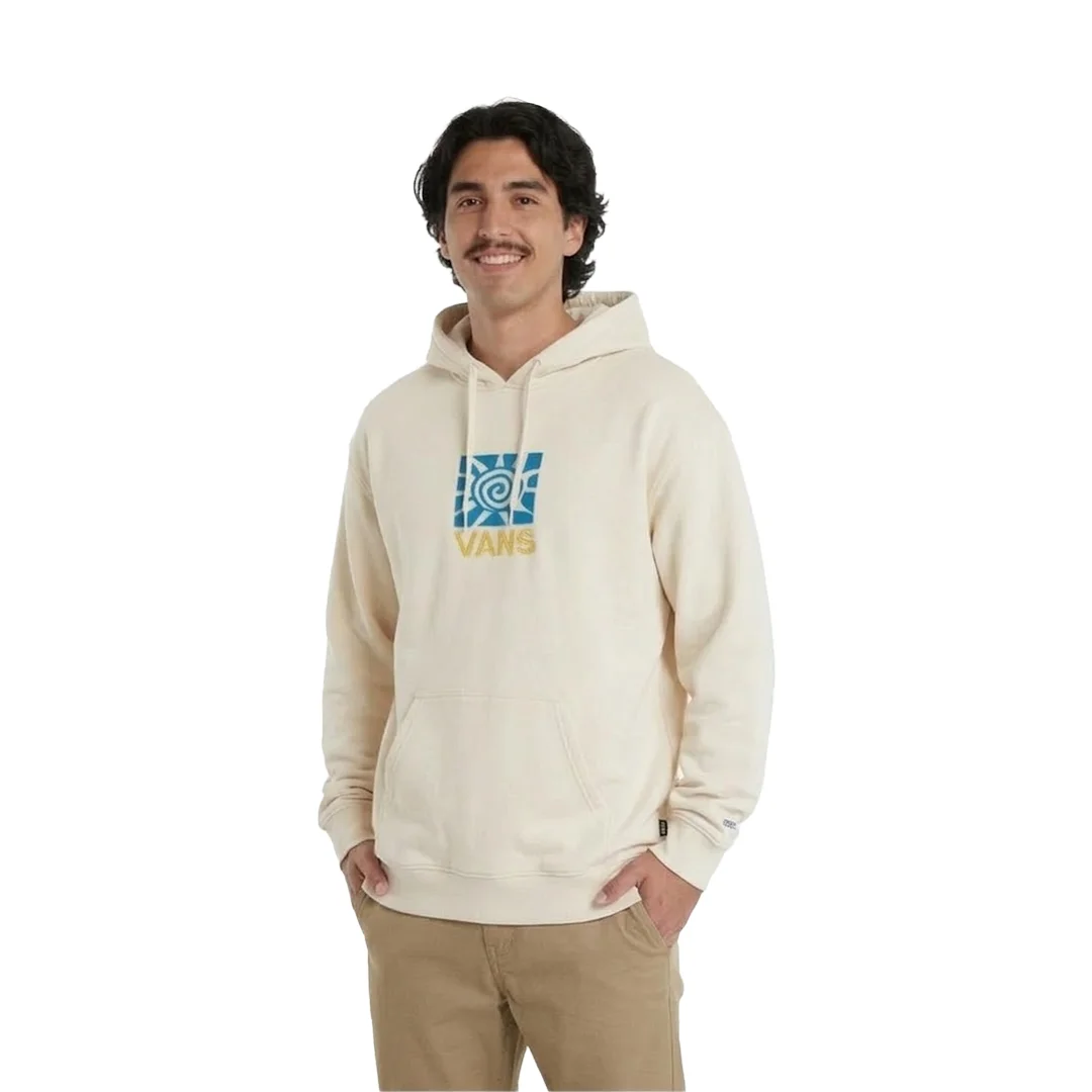 Sudadera Beige Vans Field Equipment Loose ¡Comodidad total y estilo relajado para dominar las calles! Esta hoodie en tono beige claro es la opción definitiva para los patinadores que buscan un look fresco, retro y sin restricciones. Su mayor atractivo es su corte holgado (loose fit), diseñado específicamente para darte toda la libertad de movimiento que necesitas para saltar, agacharte y caer tus trucos sin sentirte atrapado. Al frente, luce un gráfico nostálgico con un sol en espiral sobre un bloque azul y el clásico logo de VANS en amarillo, dándole una vibra muy “outdoor” y noventera a tu outfit. Con la espalda completamente limpia, esta sudadera se convierte en un básico súper versátil, ideal tanto para las madrugadas frías en el spot como para el chill después de la sesión.
