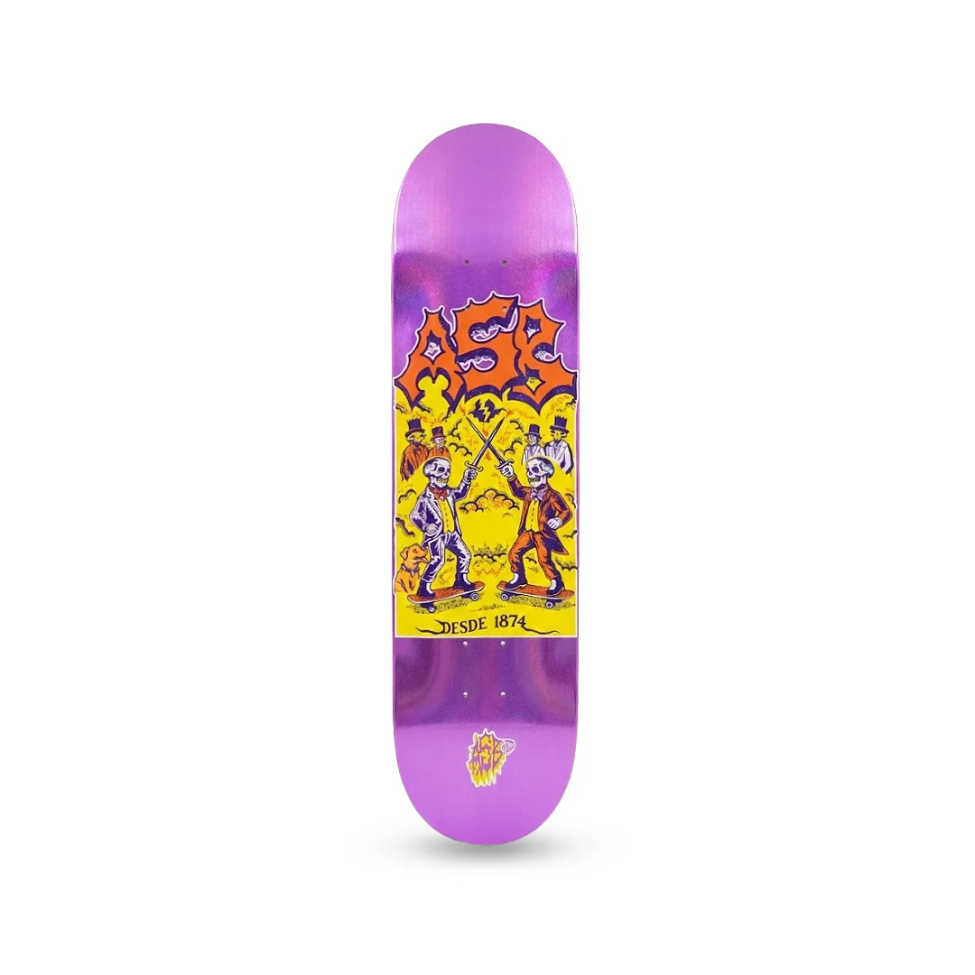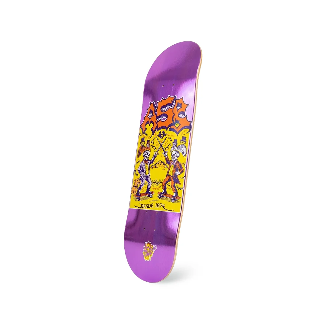 Tabla Alebrije Duelo de Catrines 8.25″ ¡Tradición mexicana, honor y mucho estilo en cada truco! Esta tabla de la marca Alebrije presenta el modelo “Duelo de Catrines”, una obra de arte que rinde homenaje a nuestras raíces con un toque callejero y divertido. El gráfico nos muestra a dos clásicos catrines cruzando espadas sobre sus patinetas, todo plasmado sobre un espectacular fondo morado con acabado metálico que brillará con el sol en cada flip. Con su medida de 8.25″, te llevas la tabla más versátil del mercado actual: lo suficientemente amplia para darte seguridad al caer de unas escaleras, pero manteniendo la agilidad perfecta para tus combos de flatground.