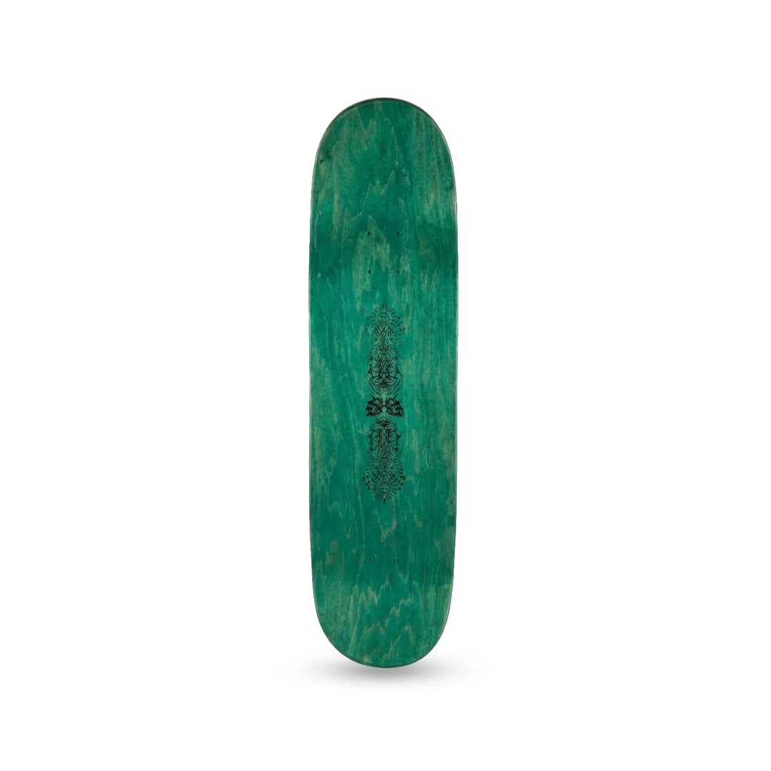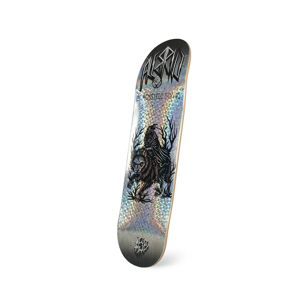 Tabla Alebrije El Monstruo Soy Yo 8.5″ ¡Actitud oscura y un brillo que corta la respiración! Esta tabla de la marca mexicana Alebrije nos presenta el modelo “El Monstruo Soy Yo”, un diseño que es pura agresividad visual. El gráfico muestra a la mismísima muerte cabalgando sobre un lobo demoníaco, plasmado sobre un impresionante fondo holográfico (foil) plata que hace resaltar el arte negro con destellos de arcoíris bajo el sol. Con su imponente ancho de 8.5″, es la “nave” definitiva para los patinadores que exigen la máxima estabilidad. Es la plataforma perfecta para volar en bowls, dominar transiciones altas, o simplemente rodar con la confianza de tener un gran espacio bajo los pies para aterrizar con seguridad.