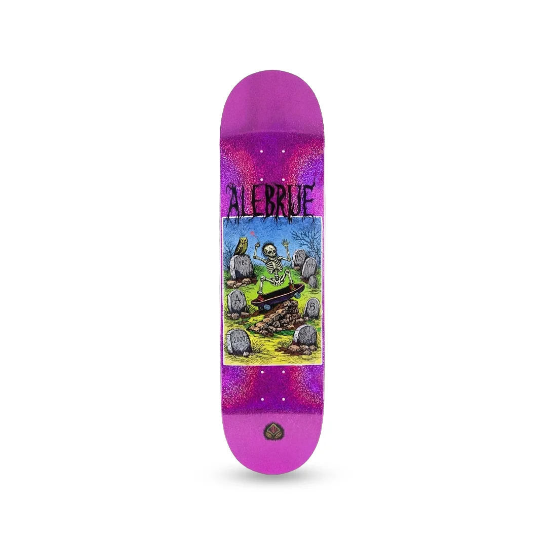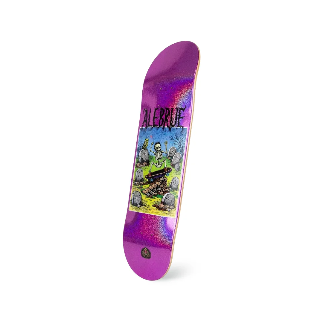 Tabla Alebrije Eterno Rider 8″ ¡Pasión inmortal por el skateboarding y agilidad técnica pura! Esta tabla de la marca mexicana Alebrije presenta el modelo “Eterno Rider”, un diseño con una filosofía muy clara: patinar hasta los huesos. El gráfico nos muestra a un esqueleto aferrándose a su tabla en medio de un cementerio, pero el verdadero protagonista es su deslumbrante fondo morado con acabado escarchado (glitter) que destellará con cada giro bajo el sol. Con su medida clásica de 8.0″, tienes en tus manos la herramienta definitiva para el street skate técnico. Es una tabla ligera y ágil, diseñada específicamente para facilitar la rotación rápida de tus flips y darte el máximo control en trucos de piso.