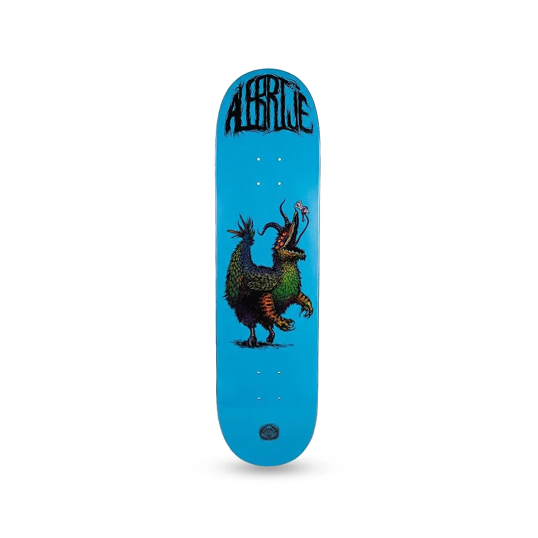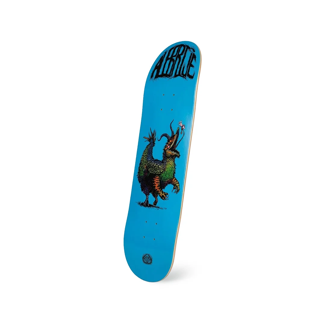 Tabla Alebrije Quimera 8.25″ ¡Desata a la bestia en el skatepark! Esta tabla de la marca mexicana Alebrije nos trae el modelo “Quimera”, un diseño que no pasa desapercibido. Presenta un fondo azul brillante que contrasta brutalmente con el logo superior estilo metalero y la ilustración central de una criatura mitológica devorando a su presa. Con una medida todoterreno de 8.25″, tienes el arma perfecta para dominar cualquier terreno: lo suficientemente amplia para aterrizar trucos de impacto en escaleras con seguridad, pero con la ligereza exacta para hacer girar tus flips en el asfalto. Fabricada con madera de maple de la más alta calidad para garantizar un pop explosivo.