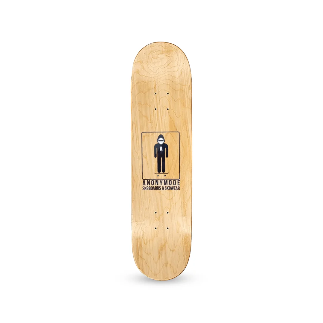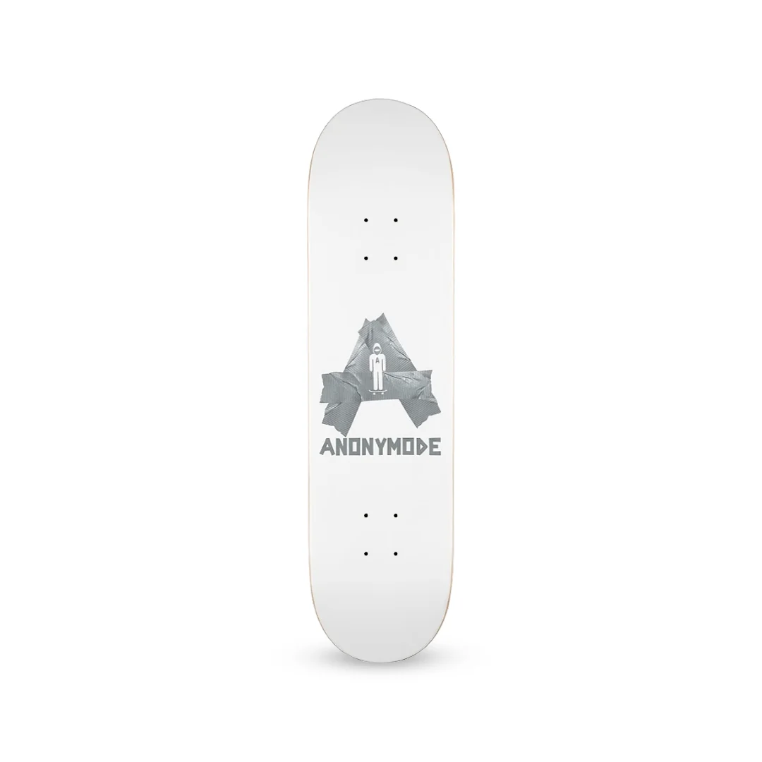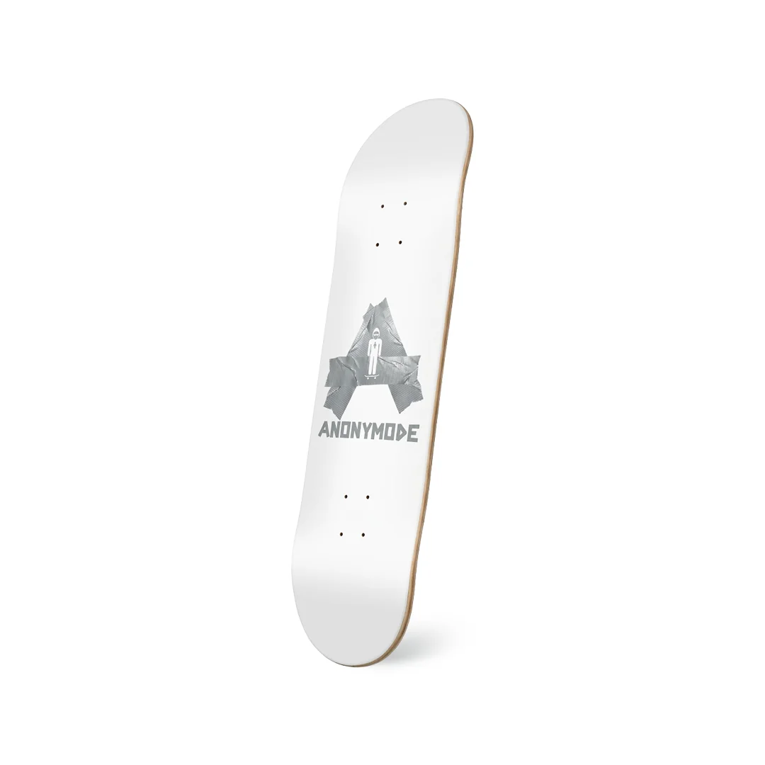 Tabla Anonymode Letter A ¡Añade una dosis de ingenio y textura a tu setup! Esta tabla de Anonymode presenta el modelo “Letter A”, con un gráfico central que forma la letra inicial de la marca utilizando una textura realista de cinta adhesiva industrial (duct tape). Sobre el fondo blanco impecable, resalta el icónico personaje “Anonymo” y la tipografía geométrica de la marca, creando un contraste visual moderno y sofisticado. Fabricada con maple profesional de 7 capas, esta tabla ofrece un pop seco y potente, diseñada para resistir el uso rudo y constante de quienes patinan con intensidad en cualquier superficie.