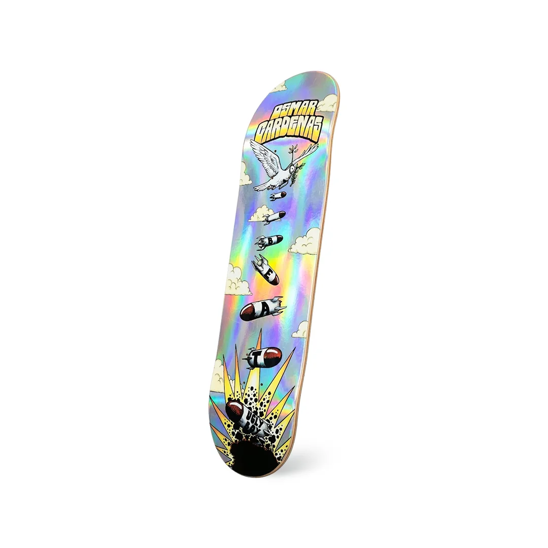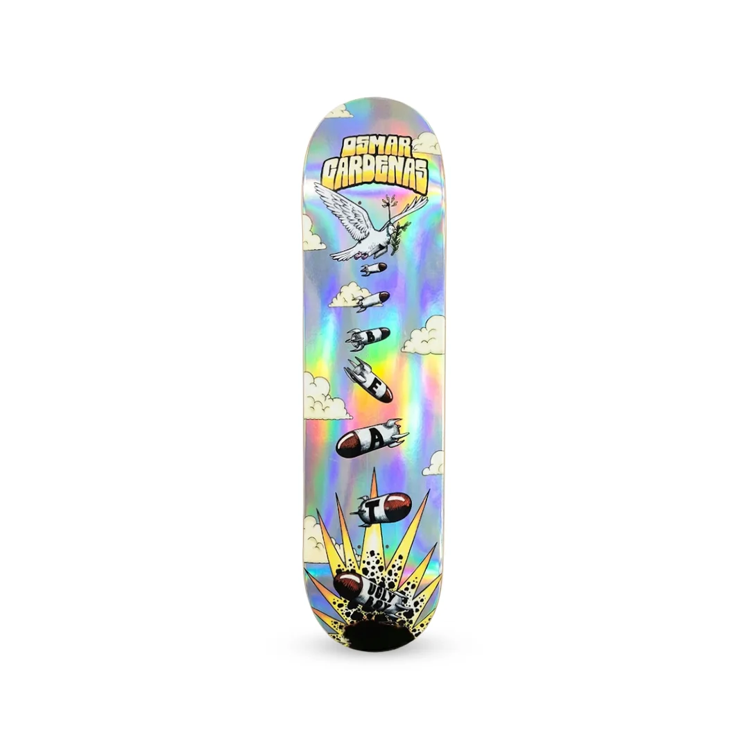 Tabla Beat Signature Osmar Cardenas Peace Bombs Foil Plata 8.25″ ¡Estilo explosivo y un brillo de otro nivel con el pro-model de Osmar Cárdenas! Esta tabla presenta el gráfico “Peace Bombs”, una propuesta audaz donde una paloma de la paz lanza bombas que deletrean la palabra “BEAT”, todo resaltado sobre un fondo Foil Plata (Silver) que genera reflejos espectaculares bajo cualquier luz. Fabricada con 7 capas de maple profesional, este deck ofrece un pop legendario y una resistencia estructural de primer nivel, ideal para quienes buscan un equipo con actitud visual y un rendimiento técnico impecable.