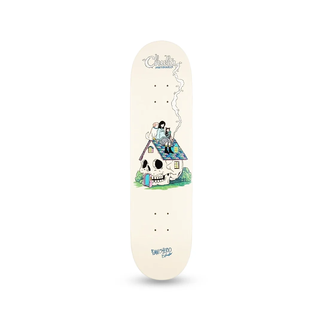 Tabla Chula Dark Cute 8″ ¡El equilibrio perfecto entre lo dulce y lo sombrío para tus mejores trucos! Esta tabla de la marca Chula Skateboards presenta el modelo “Dark Cute”, una pieza de arte diseñada por Planisferio Estudio. El gráfico destaca por su estilo de ilustración detallado y nostálgico, mostrando una escena tranquila de una niña y sus animales sobre una casa-cráneo, resaltando con nitidez sobre un elegante fondo color crema. Con su medida técnica de 8.0″, tienes en tus manos la herramienta definitiva para el street skate más preciso. Es una tabla sumamente ágil y ligera, diseñada específicamente para facilitar la rotación de tus flips y darte una respuesta inmediata en tus combos de piso.