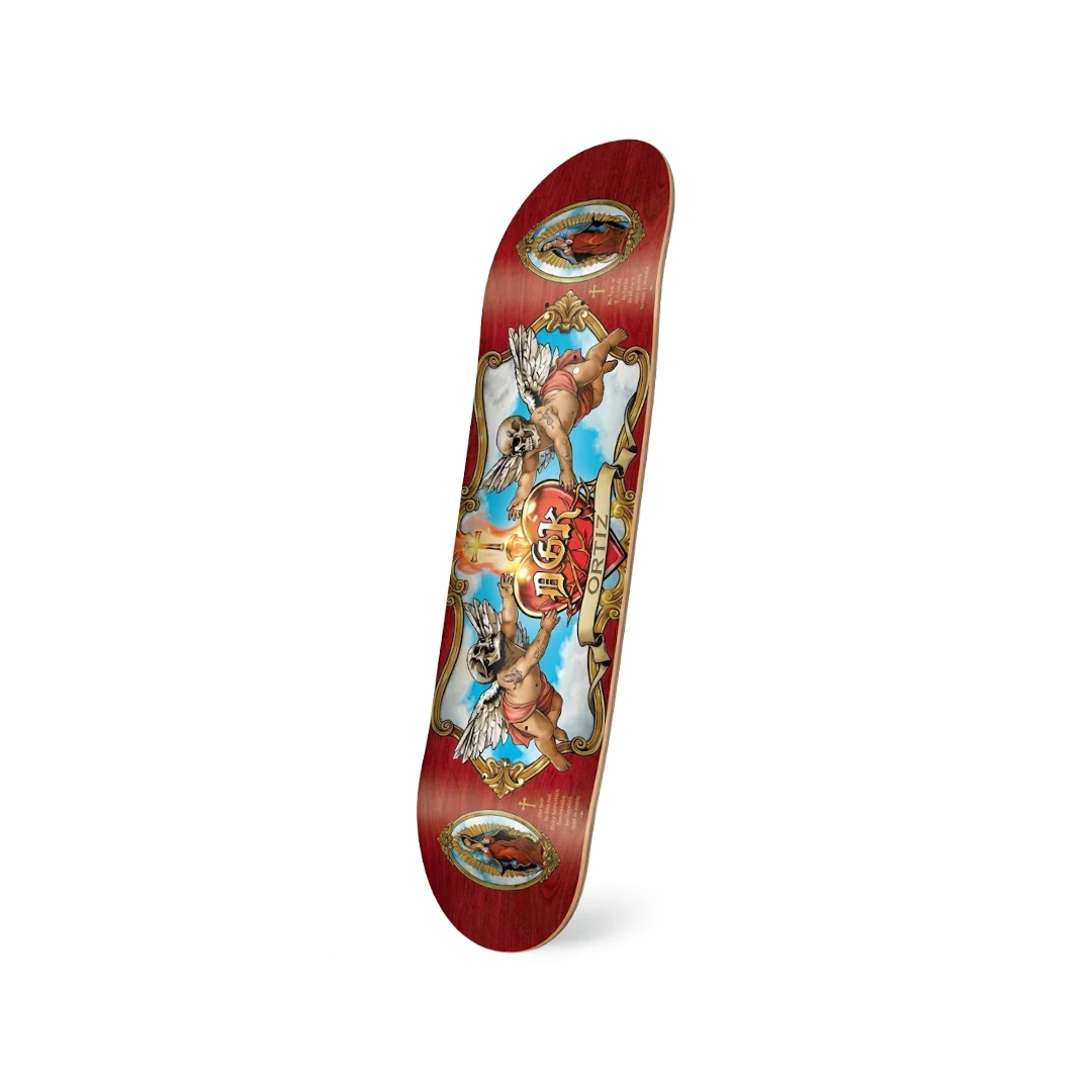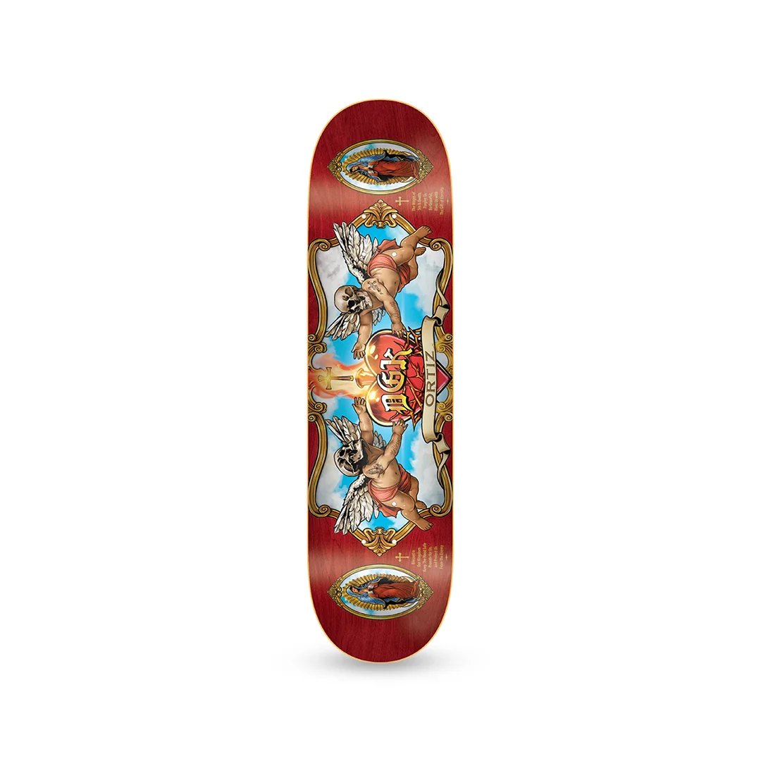 Tabla DGK Oración Ortiz 8.06″ ¡Devoción y estilo eterno! Este es el Pro Model de Chaz Ortiz y presenta una obra de arte visual bajo el nombre “Oración”. El diseño destaca por su fondo en tono madera rojiza, adornado con marcos dorados que encierran a la Virgen de Guadalupe en los extremos y una escena central impactante: dos querubines con rostros de calavera custodiando el corazón de DGK. Con la medida ultra-específica de 8.06″, es una tabla de “cirujano”: ofrece ese milímetro extra sobre la 8.0″ estándar para mayor estabilidad, sin perder ni un gramo de agilidad técnica.
