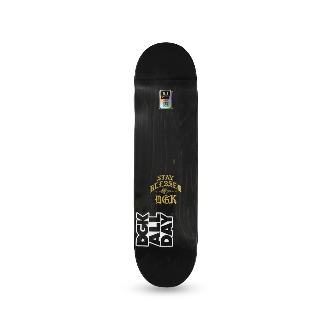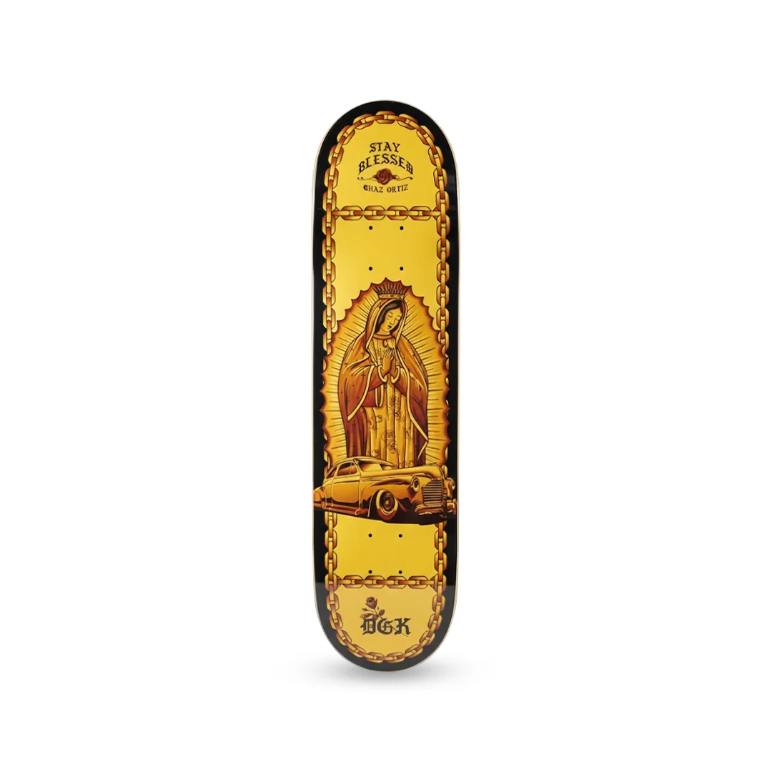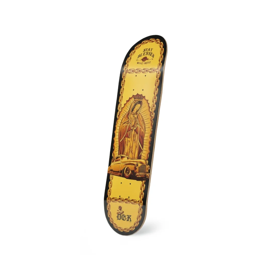 Tabla DGK Ortiz Lo Side 8.1″ ¡Estilo, fe y cultura en oro puro! Este es el Pro Model de Chaz Ortiz y es una verdadera obra de arte. El diseño “Stay Blessed” presenta una estética Chicano impecable: la imagen de la Virgen protegiendo el camino, un clásico Lowrider a sus pies y todo enmarcado por cadenas doradas sobre un fondo amarillo intenso. Con la medida precisa de 8.1″, esta tabla no solo es un símbolo de identidad y protección, sino una herramienta de precisión técnica para quienes buscan el equilibrio exacto entre agilidad y control.