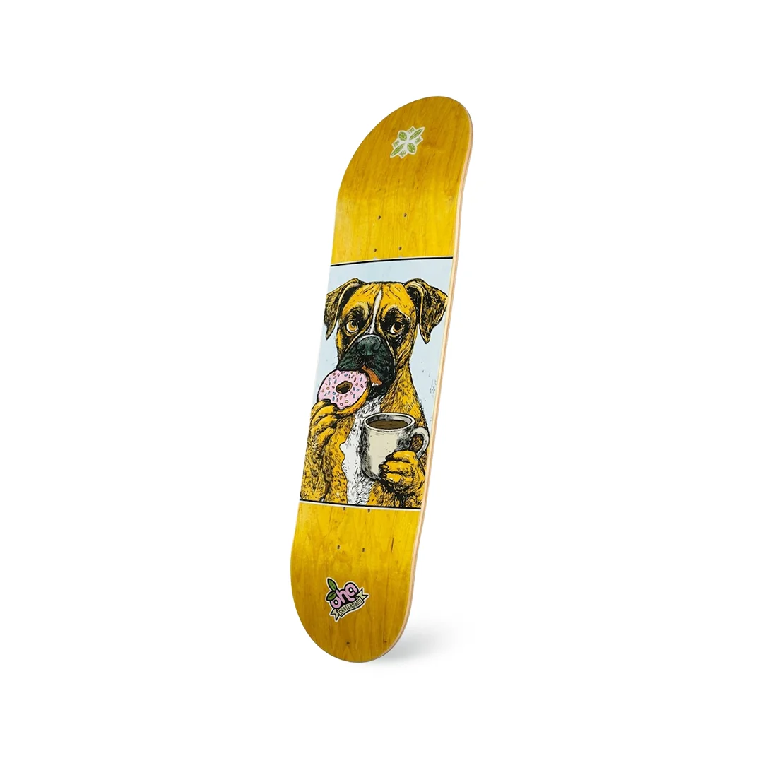 Tabla Oha Dulce Mordida 8″ ¡El desayuno de los campeones para destrozar el asfalto! Esta tabla de la marca Oha nos presenta el modelo “Dulce Mordida”, un diseño súper divertido y con muchísima personalidad. El gráfico muestra a un perro Bóxer listo para arrancar el día con su dona glaseada y su taza de café, todo plasmado sobre un vibrante fondo amarillo entintado que deja ver la veta natural de la madera. Con su medida clásica de 8.0″, tienes en tus manos la herramienta definitiva para el street skate más técnico. Es una tabla ágil, estrecha y muy ligera, diseñada específicamente para facilitar la rotación de tus flips y darte una respuesta rapidísima en tus trucos de piso.