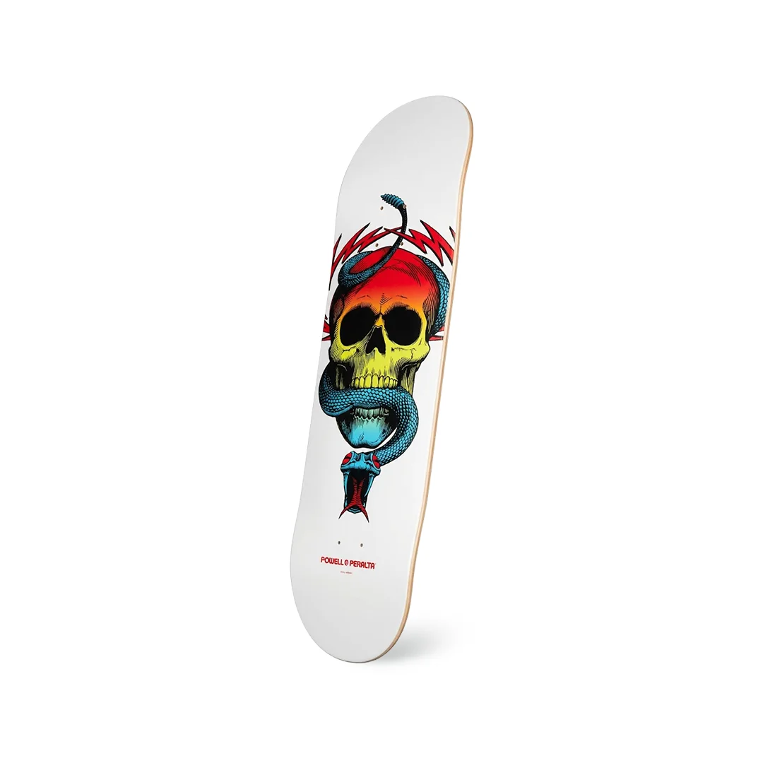 Tabla Powell Peralta McGill Skull & Snake Yellow Fade 244 8.5″ ¡El legado del inventor del McTwist bajo tus pies! Esta tabla es el Pro Model del legendario Mike McGill para la icónica marca Powell Peralta. El gráfico presenta uno de los artes más reconocidos en la historia del skate: el clásico “Skull & Snake” (Cráneo y Serpiente), destacando en esta edición con un deslumbrante degradado amarillo/rojo en el cráneo sobre un fondo blanco inmaculado. Construida con el versátil “Shape 244″ de Powell y un ancho de 8.5”, es la plataforma definitiva para dominar el bowl, destruir rampas o rodar por la calle con una estabilidad y control insuperables.