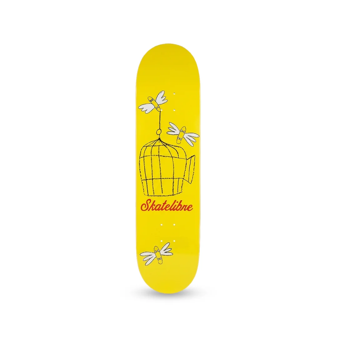 Tabla Skatelibre Jaula ¡Libera tu potencial con un diseño que simboliza la libertad absoluta! Esta tabla de Skatelibre presenta el modelo “Jaula”, un gráfico conceptual sobre un fondo amarillo brillante que captura la atención de inmediato. La ilustración muestra una jaula abierta siendo transportada por personajes alados, representando el espíritu libre del skateboarding. Con el logotipo clásico de Skatelibre en cursiva roja, esta tabla combina un mensaje potente con una estética limpia y moderna. Fabricada con maple profesional de 7 capas, ofrece la respuesta técnica y el pop necesarios para romper cualquier barrera en la calle o el parque.