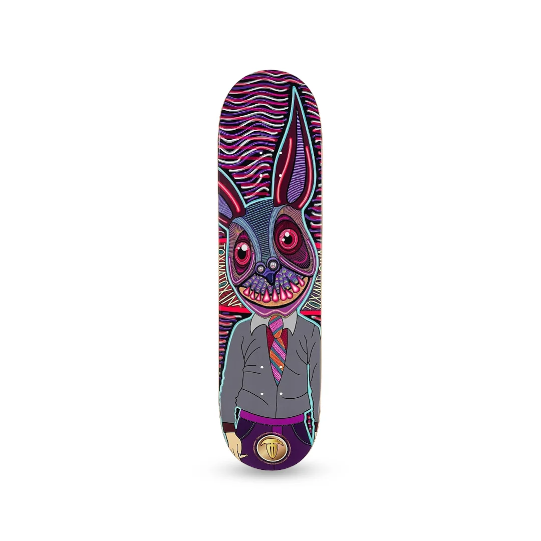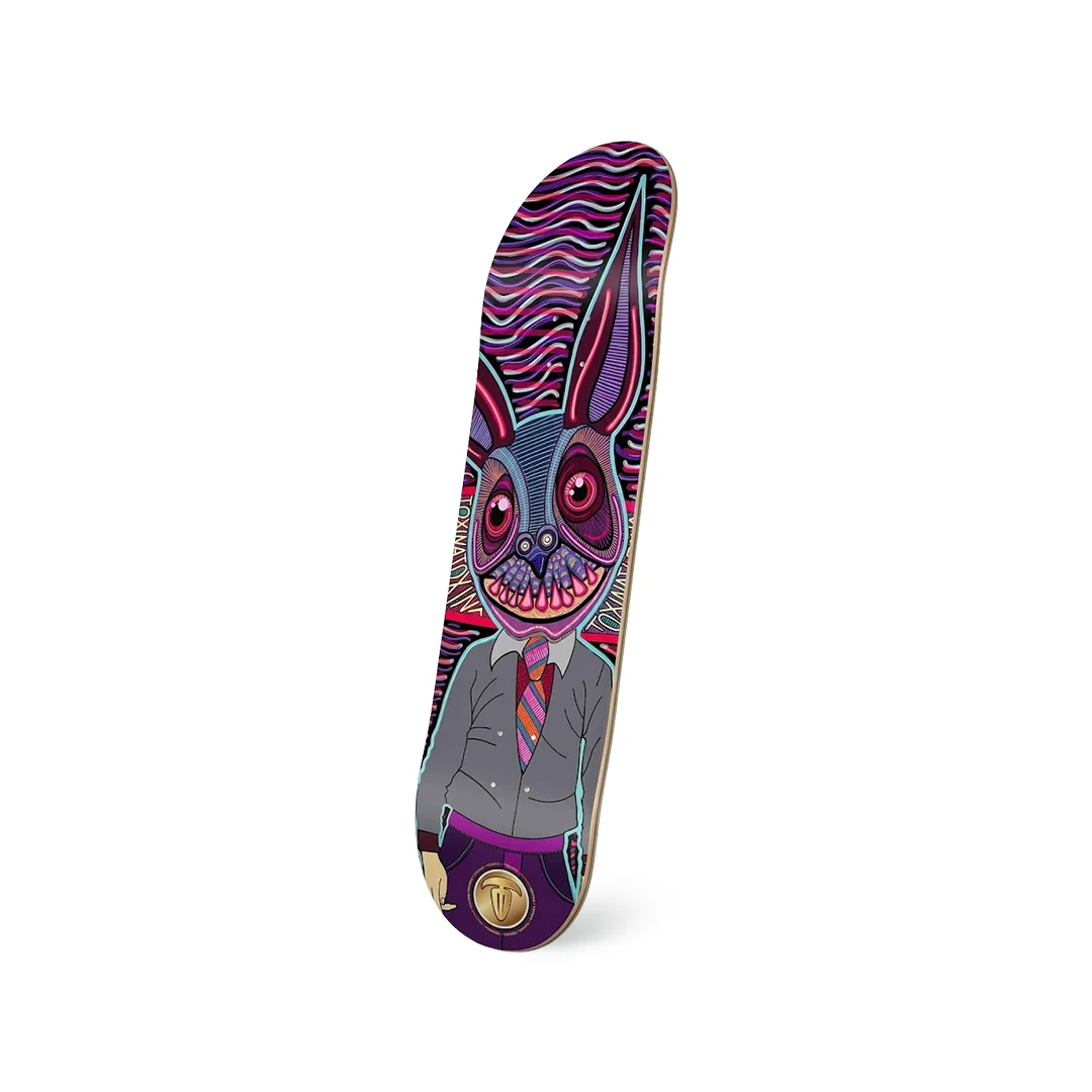 Tabla Toxina Murciélago Godín 8.5″ ¡Lleva la rutina de la oficina al skatepark con un estilo alucinante! Esta tabla de la marca Toxina presenta el modelo “Murciélago Godín”, un diseño que mezcla la sátira social con un arte visualmente explosivo. El gráfico muestra a un murciélago con atuendo formal sobre un fondo de ondas psicodélicas en morado, rosa y azul. Con su robusta medida de 8.5″, es la plataforma ideal para quienes buscan máxima estabilidad; ya sea que patines bowls, rampas grandes o simplemente prefieras una base más amplia y cómoda para tus pies, esta tabla te ofrece la seguridad necesaria para aterrizar con confianza.