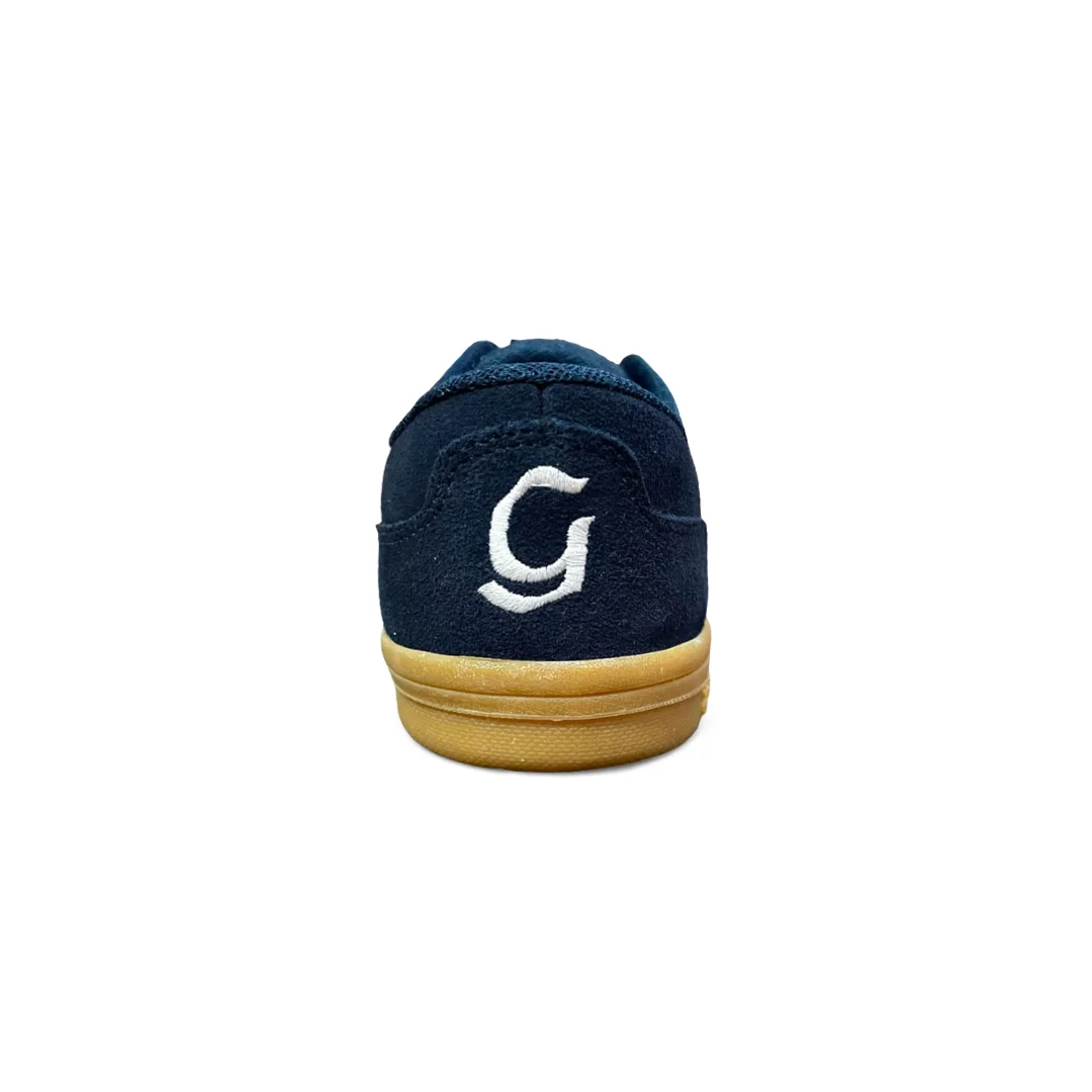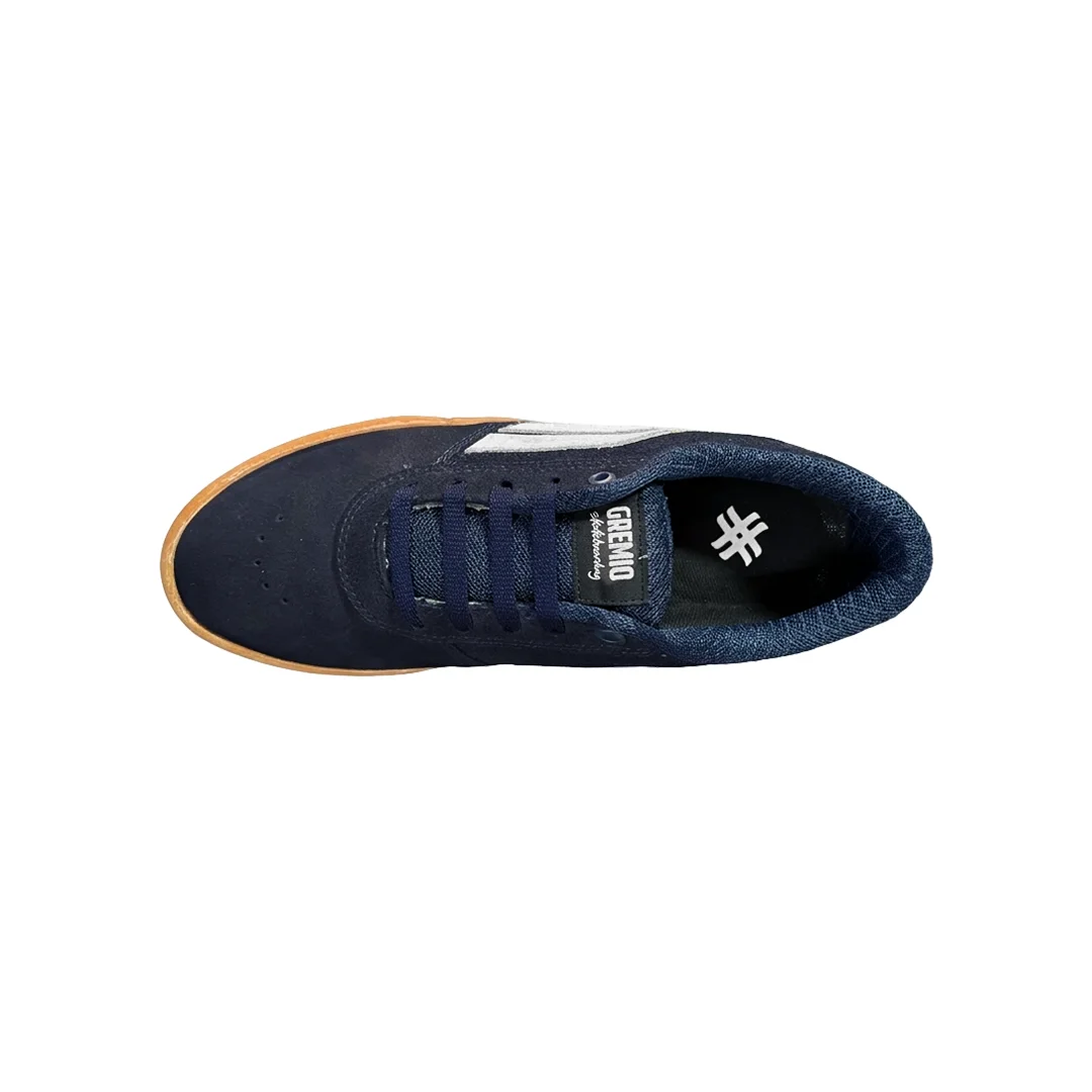 Tenis Gremio Medieval Marino Ambar. El modelo Medieval es la definición de estilo clásico y resistencia. Con una combinación de azul marino profundo y una suela de goma en tono ámbar (gum), este tenis evoca la era dorada del skate. Es un calzado robusto, diseñado para absorber impactos y brindar una comodidad superior en sesiones largas, manteniendo una estética sobria y funcional.
