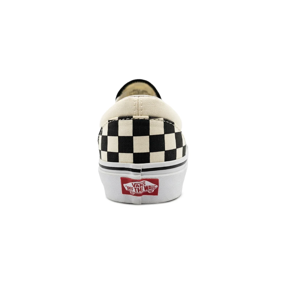 Tenis Vans Slip-On Checkerboard Classic. El modelo más icónico de Vans en su combinación de colores original. Estos Slip-On presentan el legendario patrón de tablero de ajedrez (checkerboard) que ha definido a la marca por décadas. Diseñados para ofrecer comodidad absoluta y un estilo sin esfuerzo, cuentan con inserciones elásticas laterales y el cuello acolchado característico de la línea Classic.