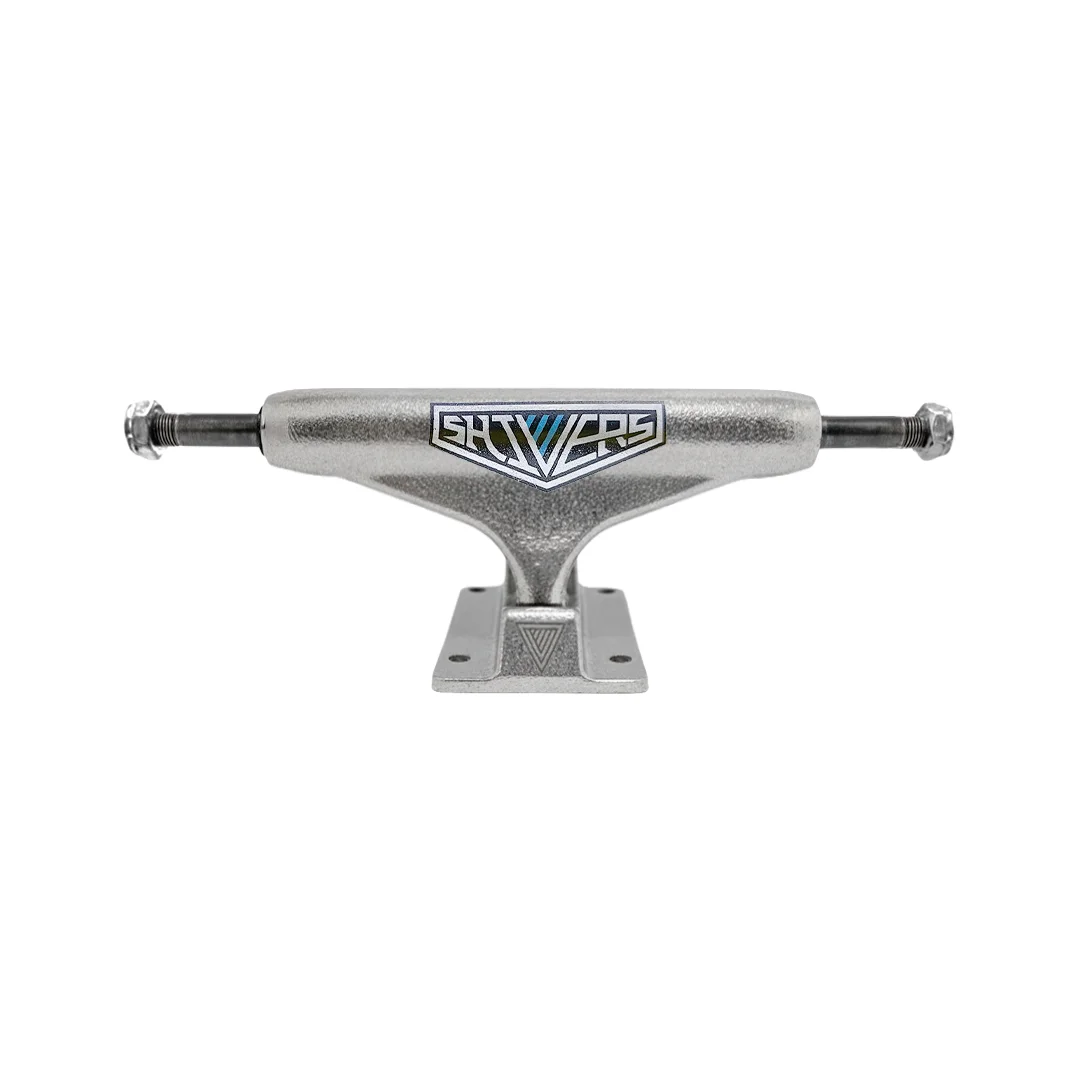 Trucks Shivers Logo Plata 8.5″: Consigue la plataforma más estable con el estilo clásico. Estos trucks Shivers de 8.5 pulgadas (Plata) son la opción ideal para decks anchos, ofreciendo una base confiable y sólida para vert, bowls y cruising. Su acabado liso en color Plata con el logo de Shivers es el look clásico que nunca falla.